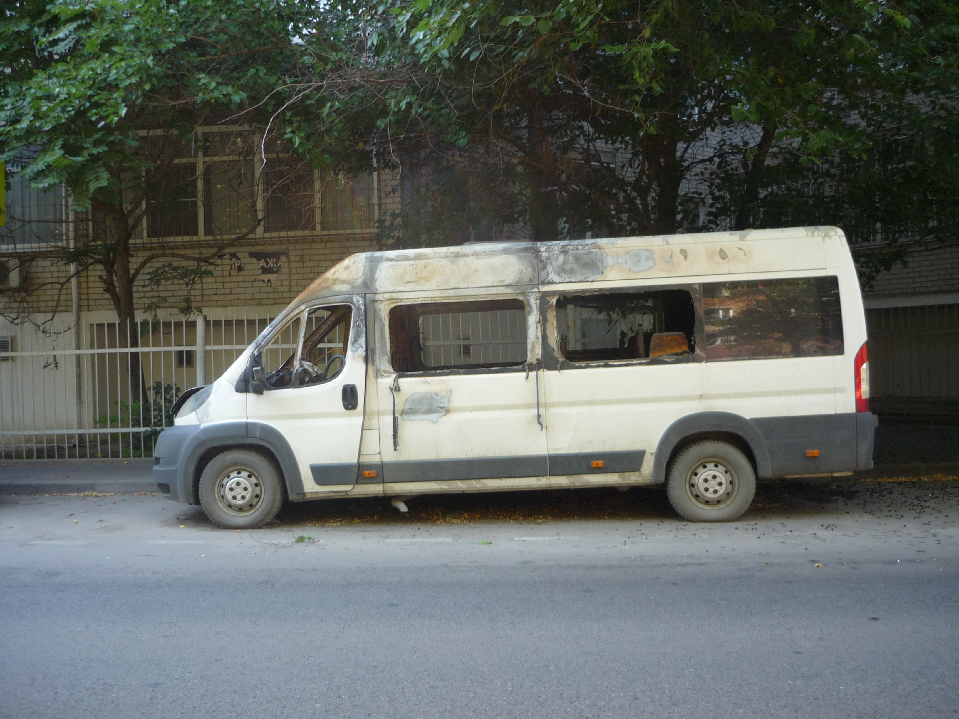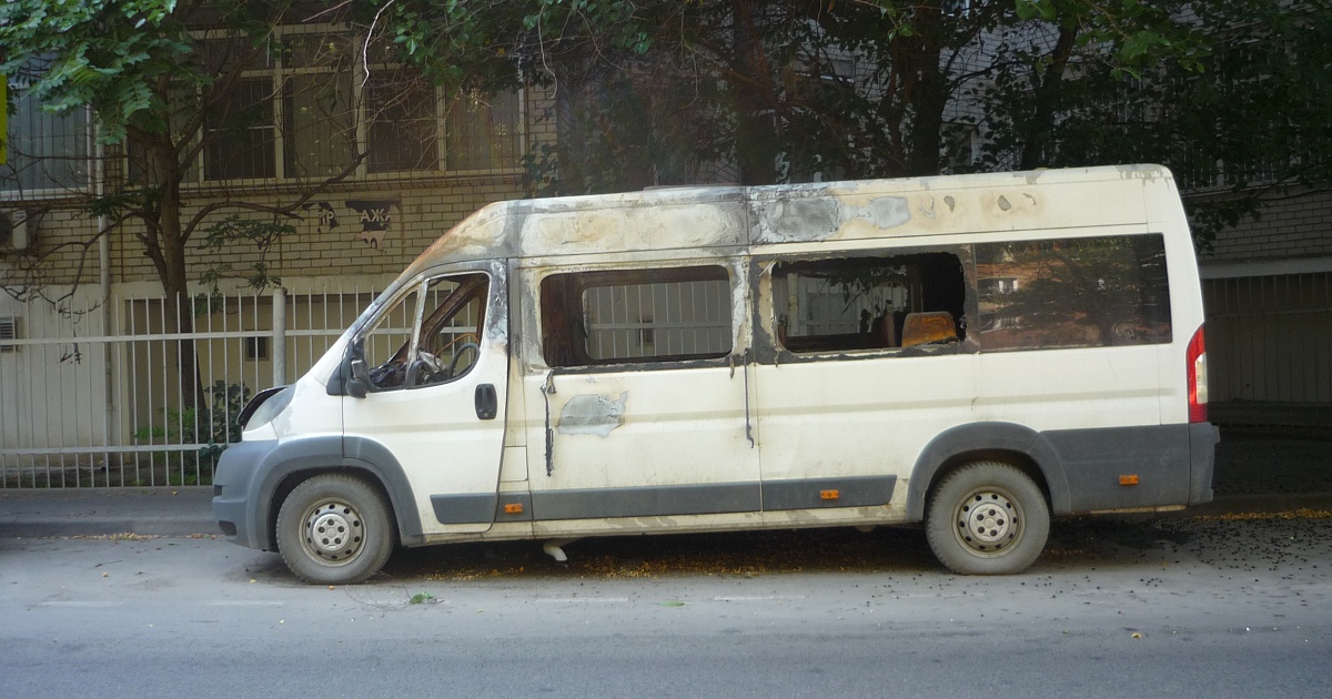 Белый микроавтобус Ситроен хозяин бросил вдоль проезжей части на ул. Володарского напротив дома 75. Иномарка пережила пожар, салон выгорел, окна выбиты, кузов обожжен.
