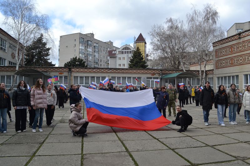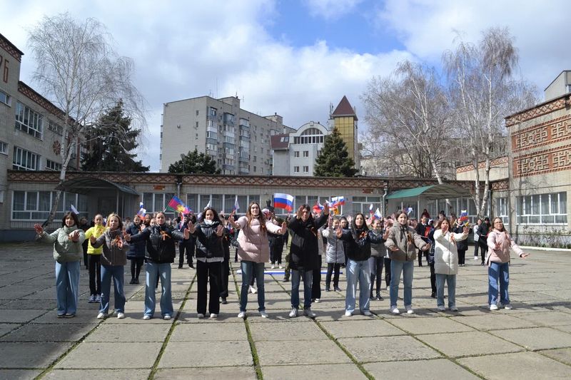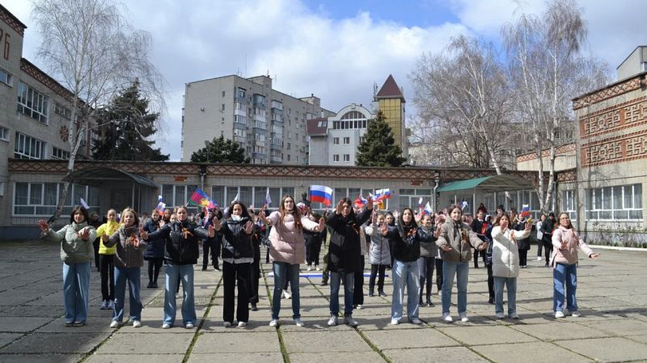 18 марта 2022В акции приняло участие более 100 человек: учащиеся старших классов, активисты Российского движения школьников, воспитанники и творческие коллективы Центра творческого развития "Центральный" и Центра творчества "Содружество". Ребята своим эмоциональным танцем выразили поддержку российским военным и исполнили песню Россия.