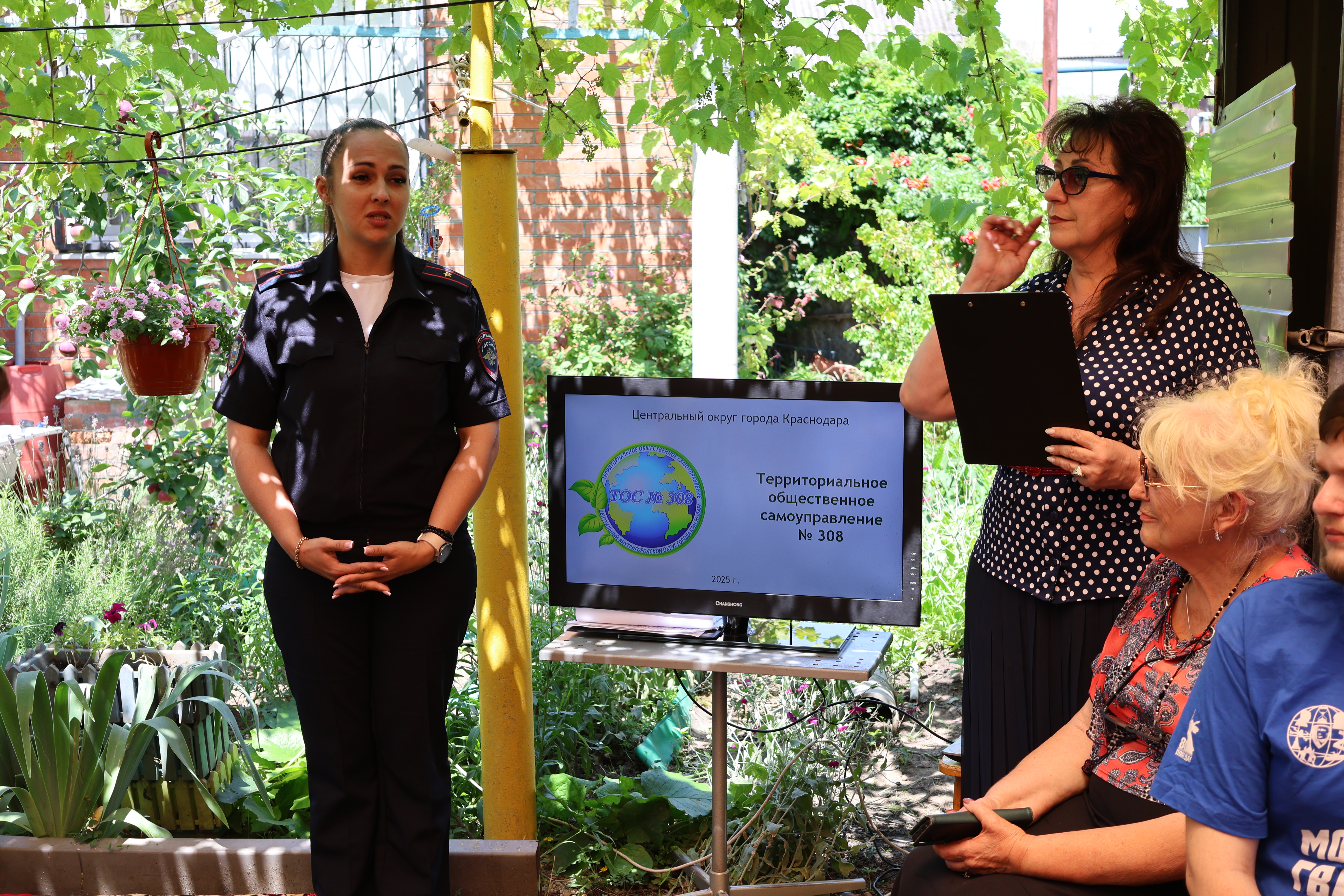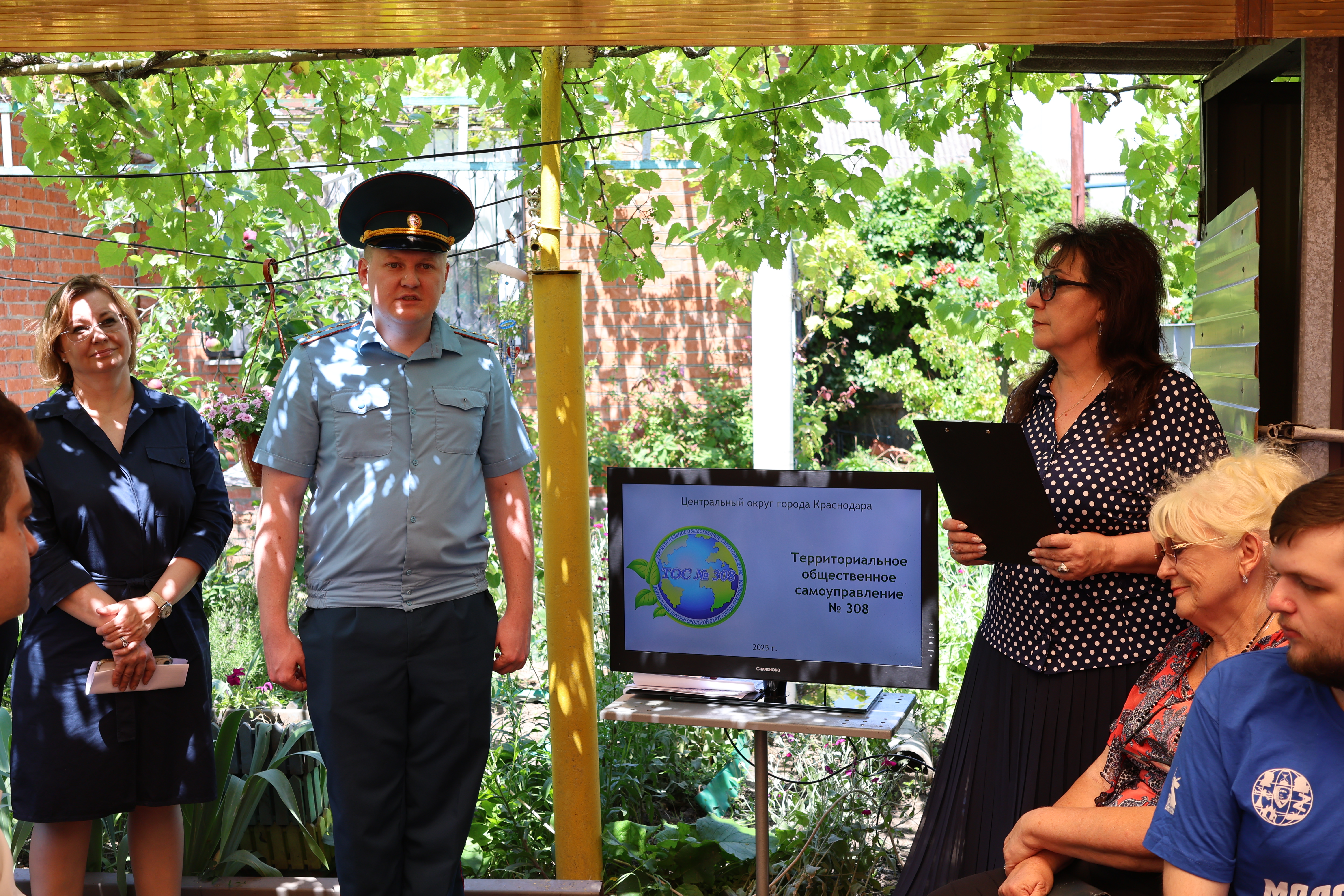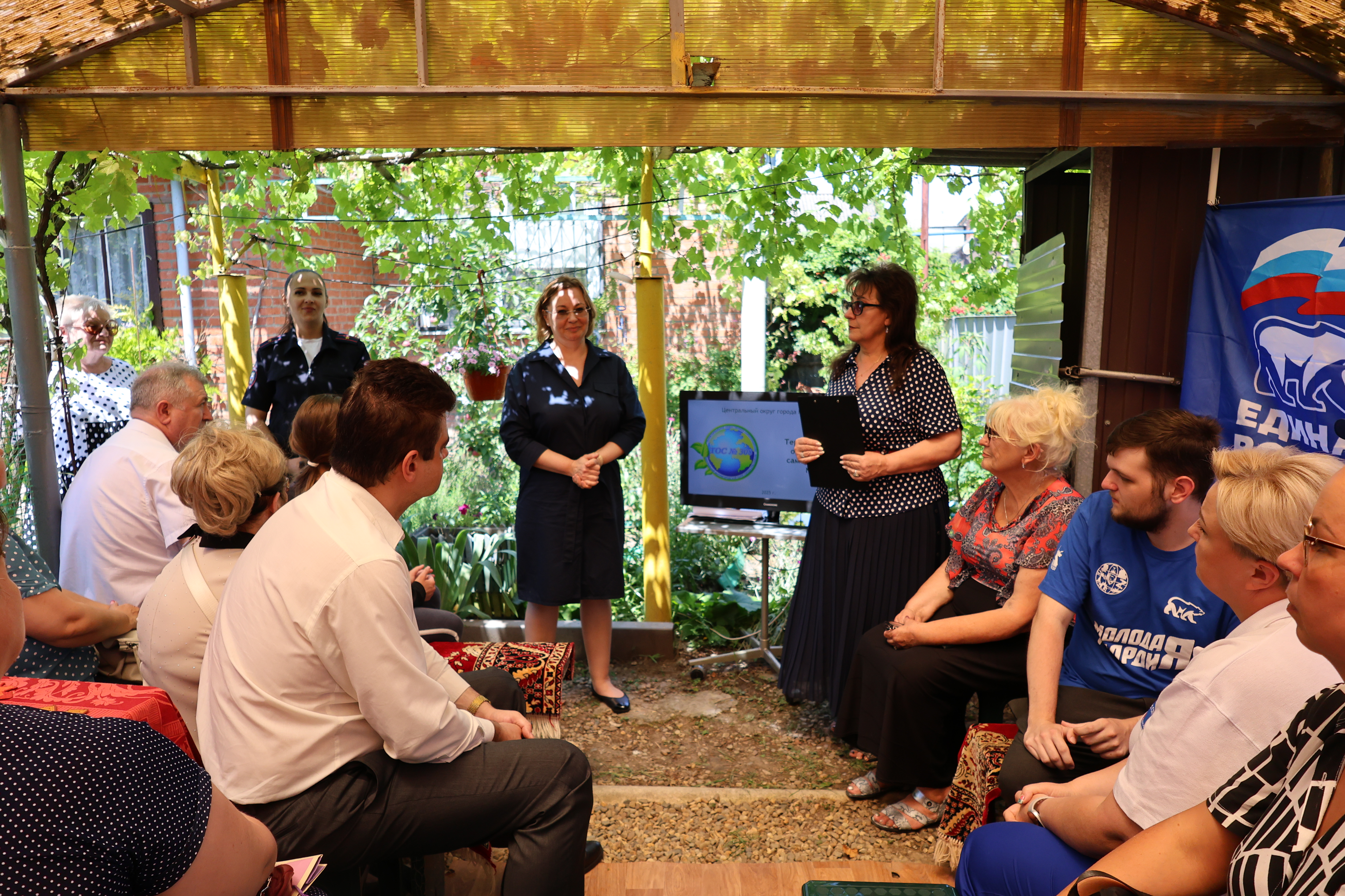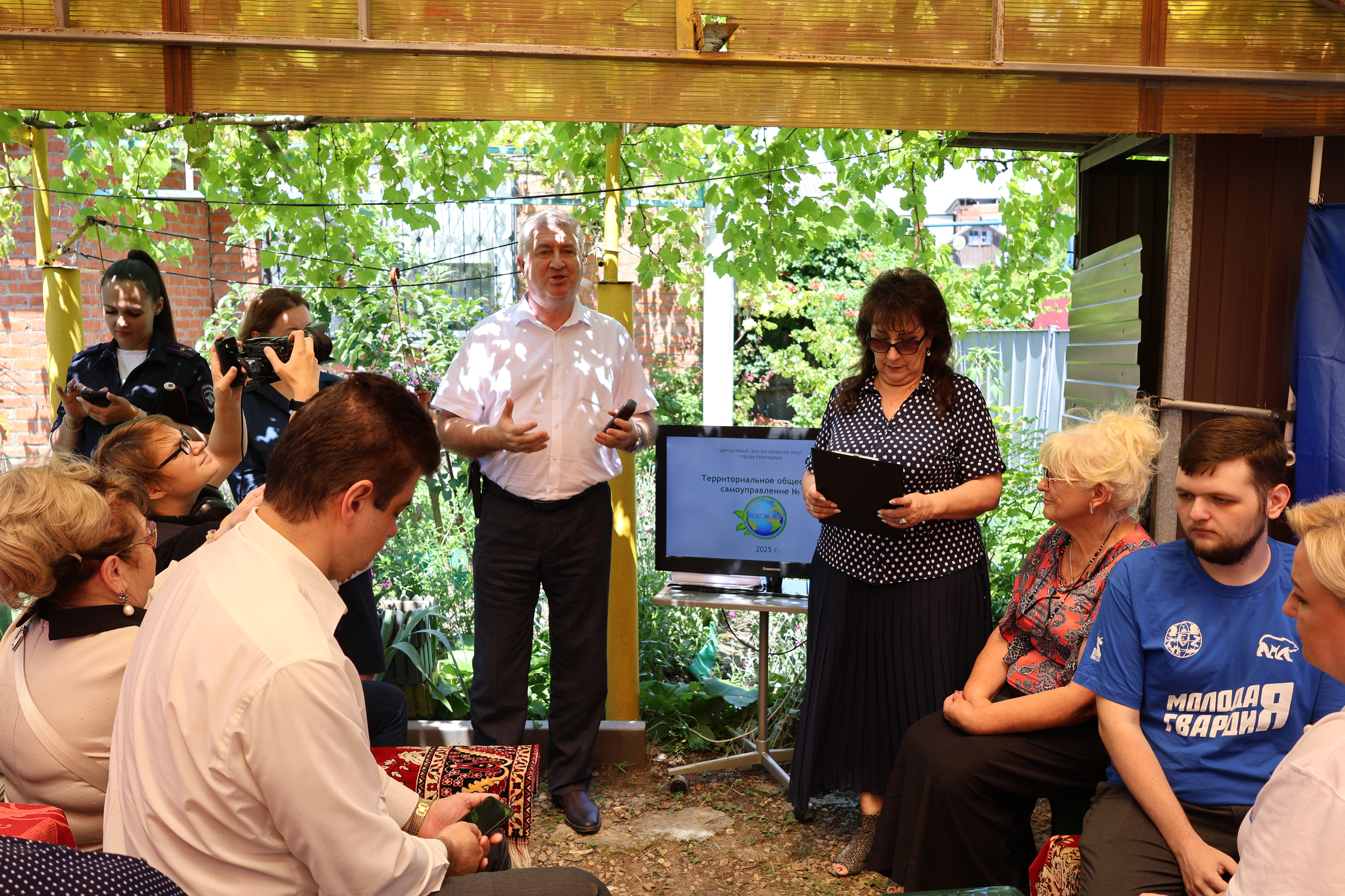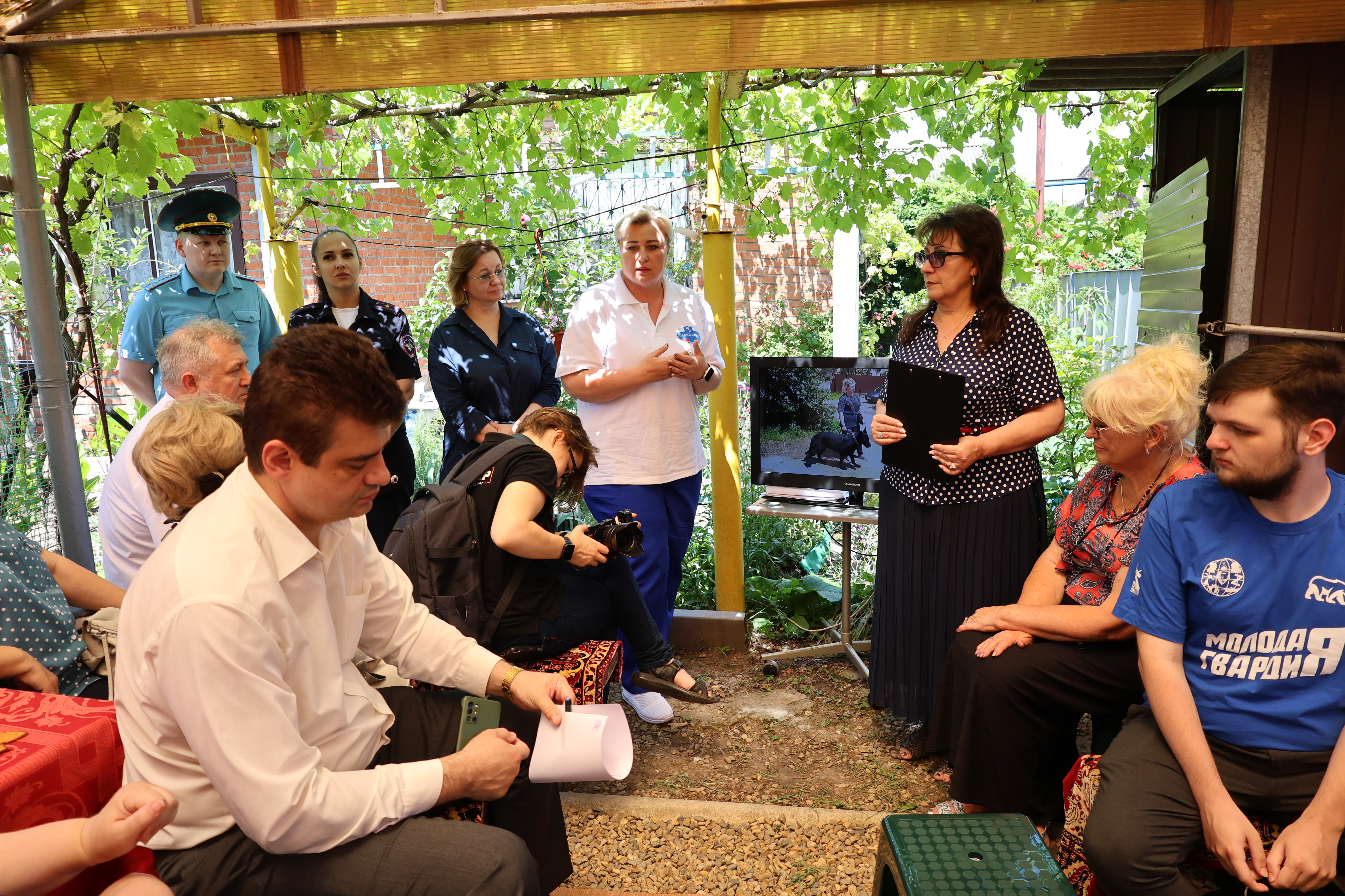 Второй локацией конкурса стал дом Любовь Ивановны, именно здесь она ведет прием граждан. А сегодня сказать слова поддержки пришли заместитель главы окружной администрации Александр Звягинцев, начальник отдела управления ветеринарии Краснодара Наталья Мовмыга, старший инспектор Пожарного надзора округа Юрий Козарезенко, старший участковый уполномоченный полиции Ирина Потоцкая, активисты партии «Единая Россия».