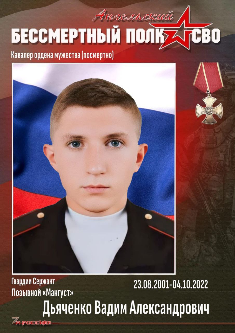 27 ноября 2024Выпускник школы, участник хореографического ансамбля «Дружба» Вадим Дьяченко добровольцем ушел в зону специальной военной операции, участвовал в тяжелейших боях в Херсонской области, где был смертельно ранен. Указом Президента России награжден орденом Мужества посмертно.