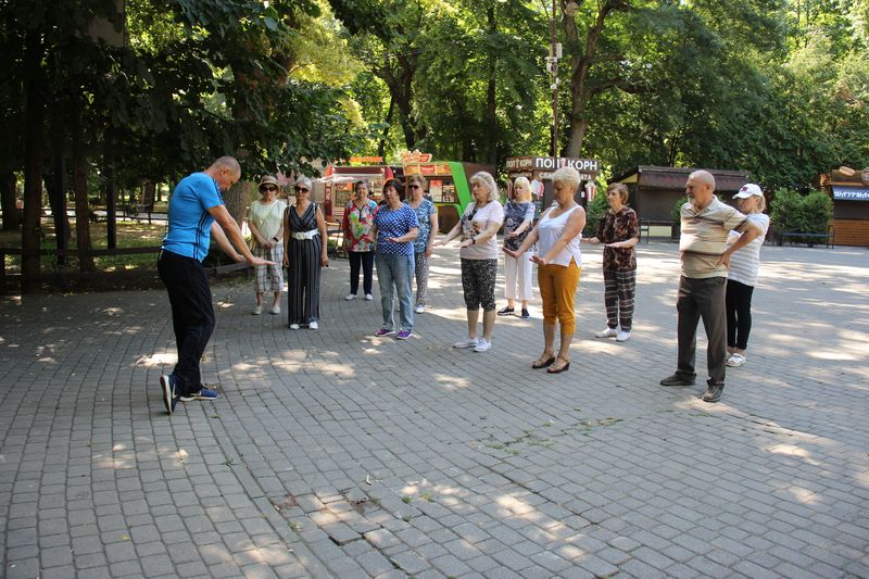 Зарядку провел ведущий специалист отдела социальной сферы администрации Центрального округа Вадим Постанин. Он подобрал специальный комплекс упражнений, учитывая особенности, связанные с возрастом и физическим состоянием людей преклонного возраста.