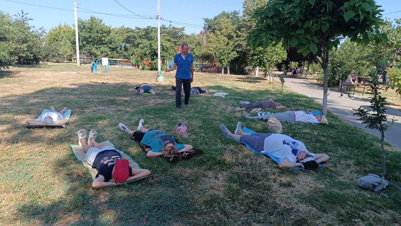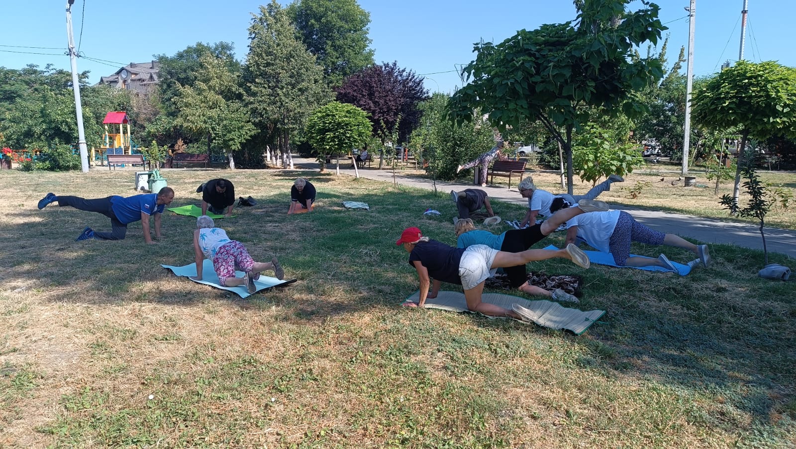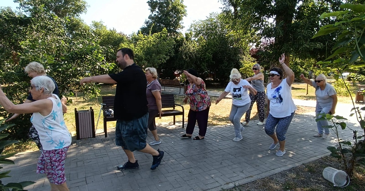 До наступления полуденного зноя выполнили упражнения, направленные на стабилизацию дыхания в условиях жаркой погоды. Затем физкультурники на гимнастических ковриках укрепили мышцы