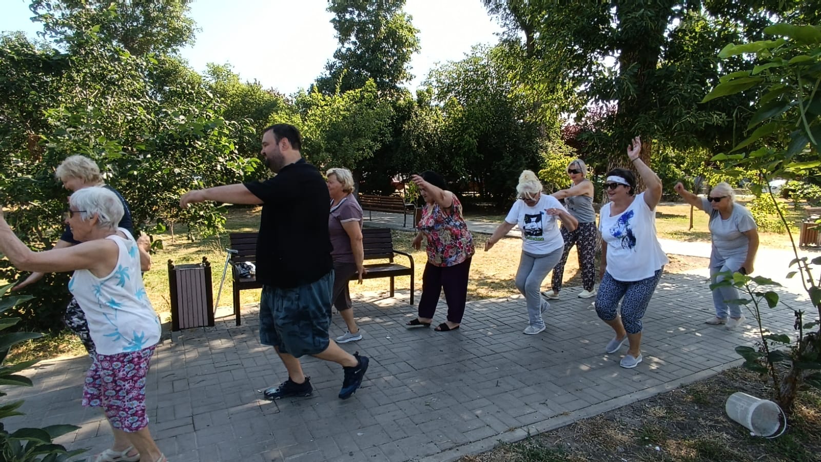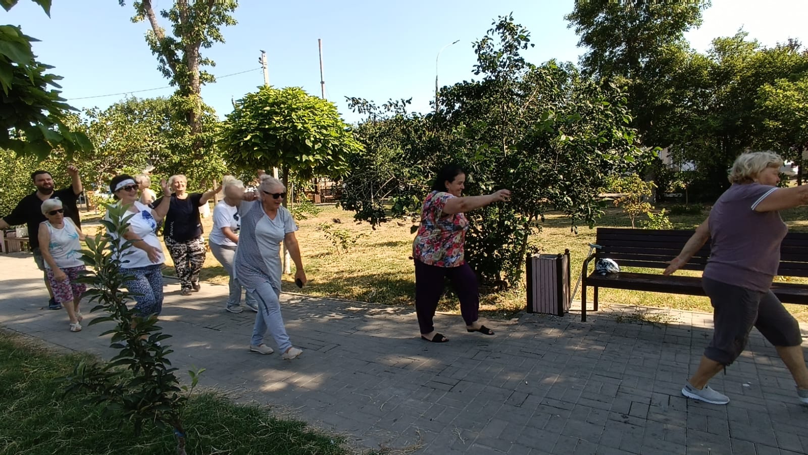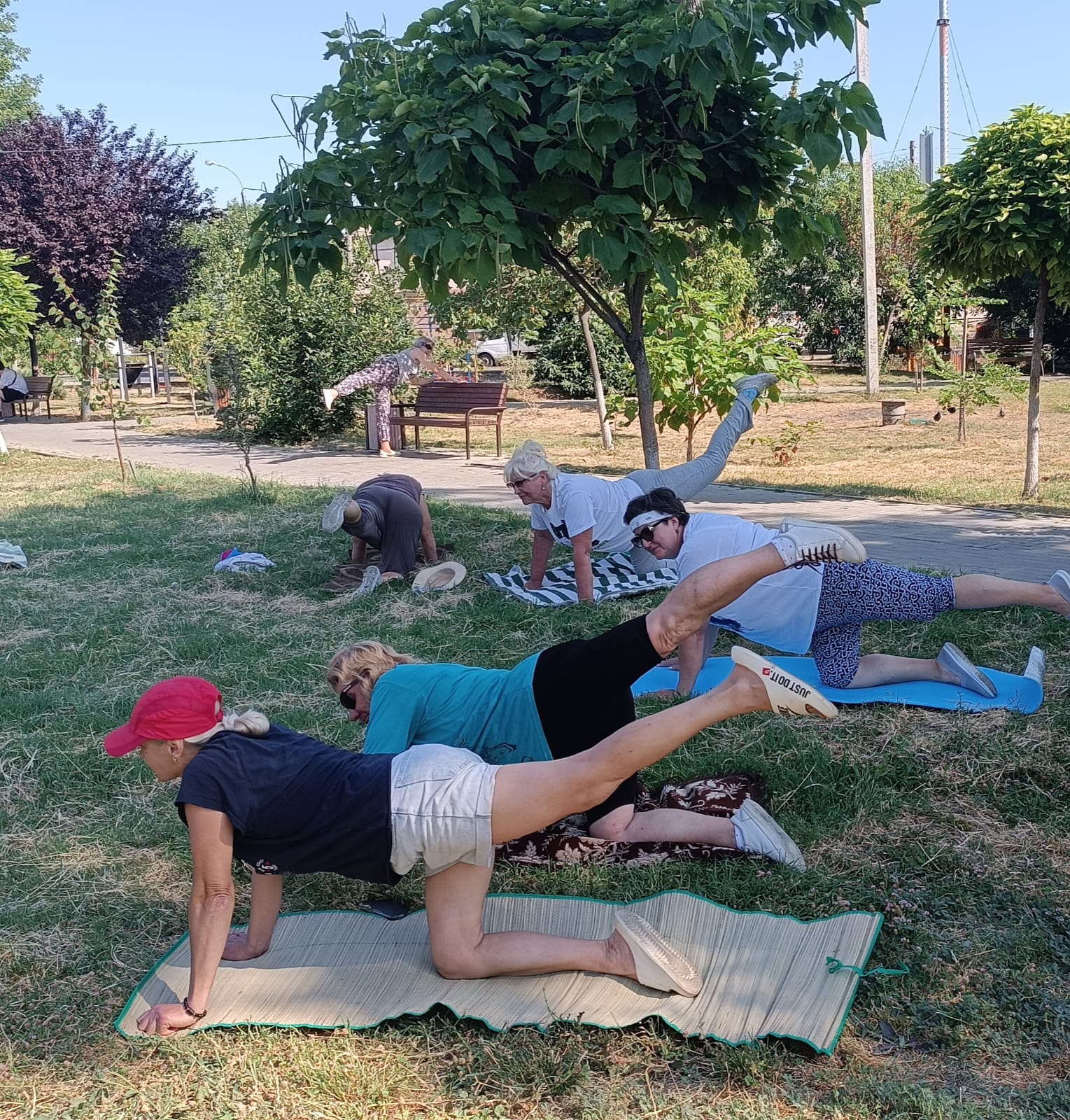 До наступления полуденного зноя выполнили упражнения, направленные на стабилизацию дыхания в условиях жаркой погоды. Затем физкультурники на гимнастических ковриках укрепили мышцы