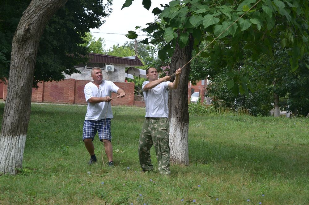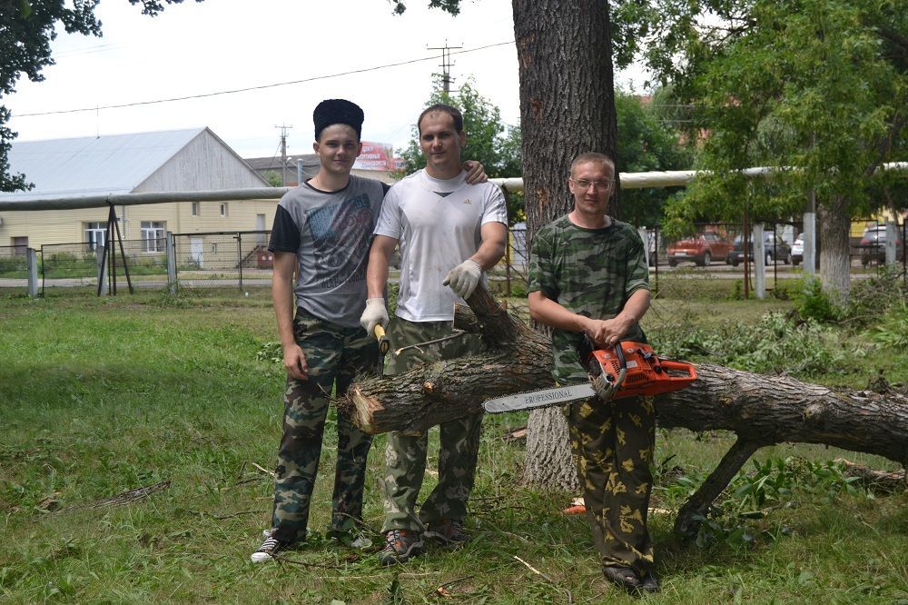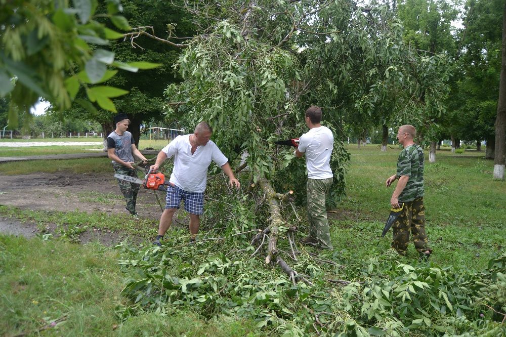 На ликвидацию неприятных последствий непогоды вышли казаки местного хуторского общества «Курень Каширинский». С помощью бензопил, ножовок, топоров, используя лестницу и веревку, казаки срезали все опасно висящие ветки и стволы, а также распилили на мелкие кусочки огромные сломанные ветром ветви. Благодаря их усилиям на территории школы снова стало чисто, уютно и безопасно.