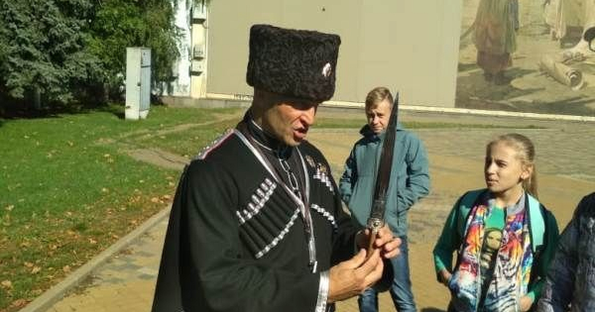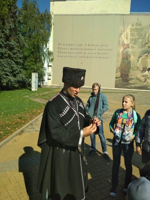 В ходе экскурсии Сергей Леонидович рассказал, как казакам достались земли Кубани, о казачьем быте в разные времена, о казачьем войске. Очень понравился казачатам рассказ о костюме казака, тем более что наставник был в парадной форме, которая называется черкеска, так же дети могли внимательно рассмотреть различные костюмы казаков на картине «Жеребьевка. Образование Кубанских станиц» (Геннадий Квашура).