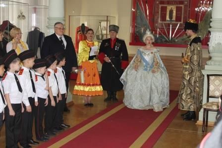 Состоялся обряд посвящения, в конце которого появилась императрица Екатерина Великая, зачитавшая указ о принятии в казачье сообщество новых казачат. После чего для ребят состоялась экскурсия по музею им. Фелицина, где они смогли осмотреть казачьи реликвии – регалии, знамена полков, награды, оружие, жалованные грамоты от императоров России.