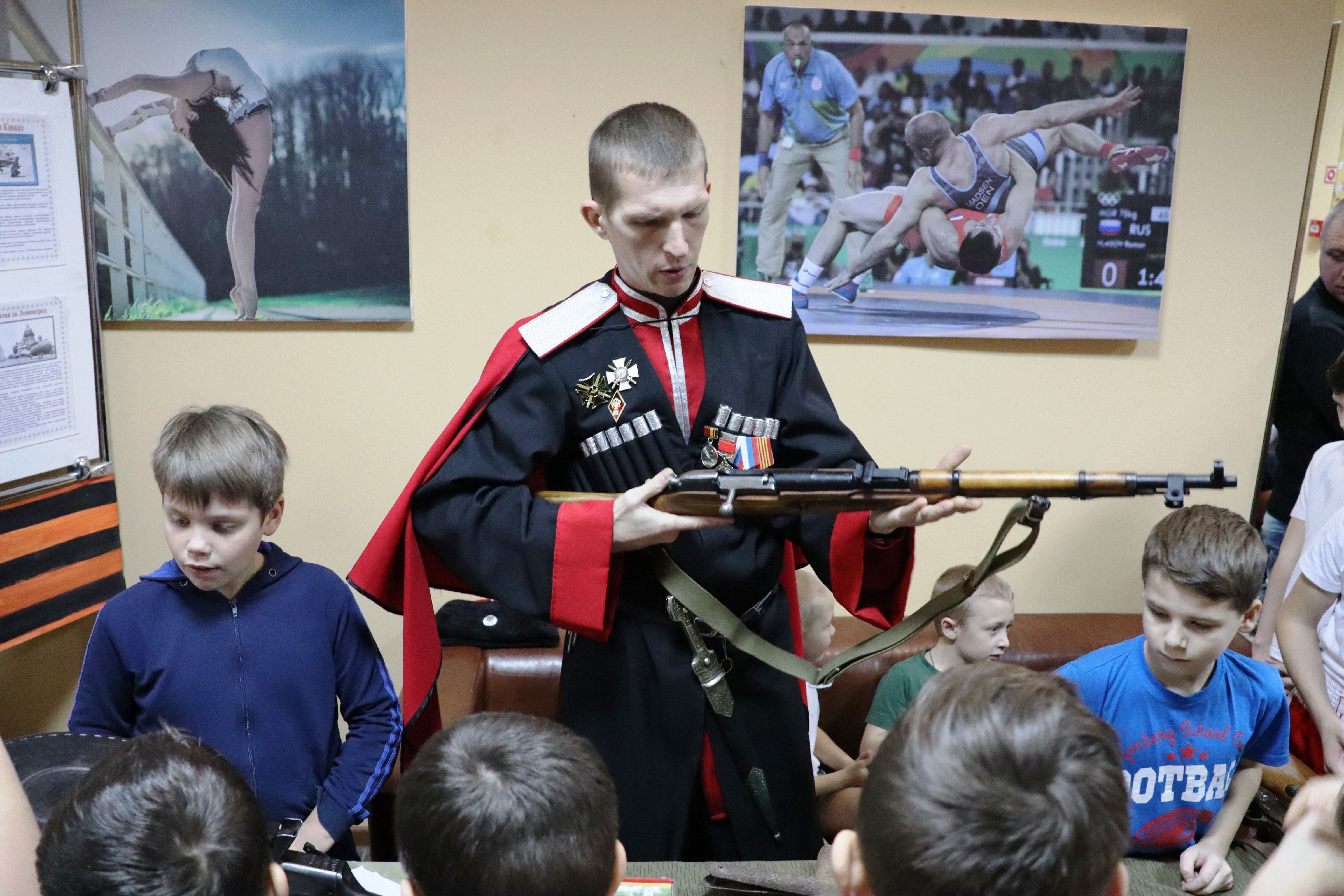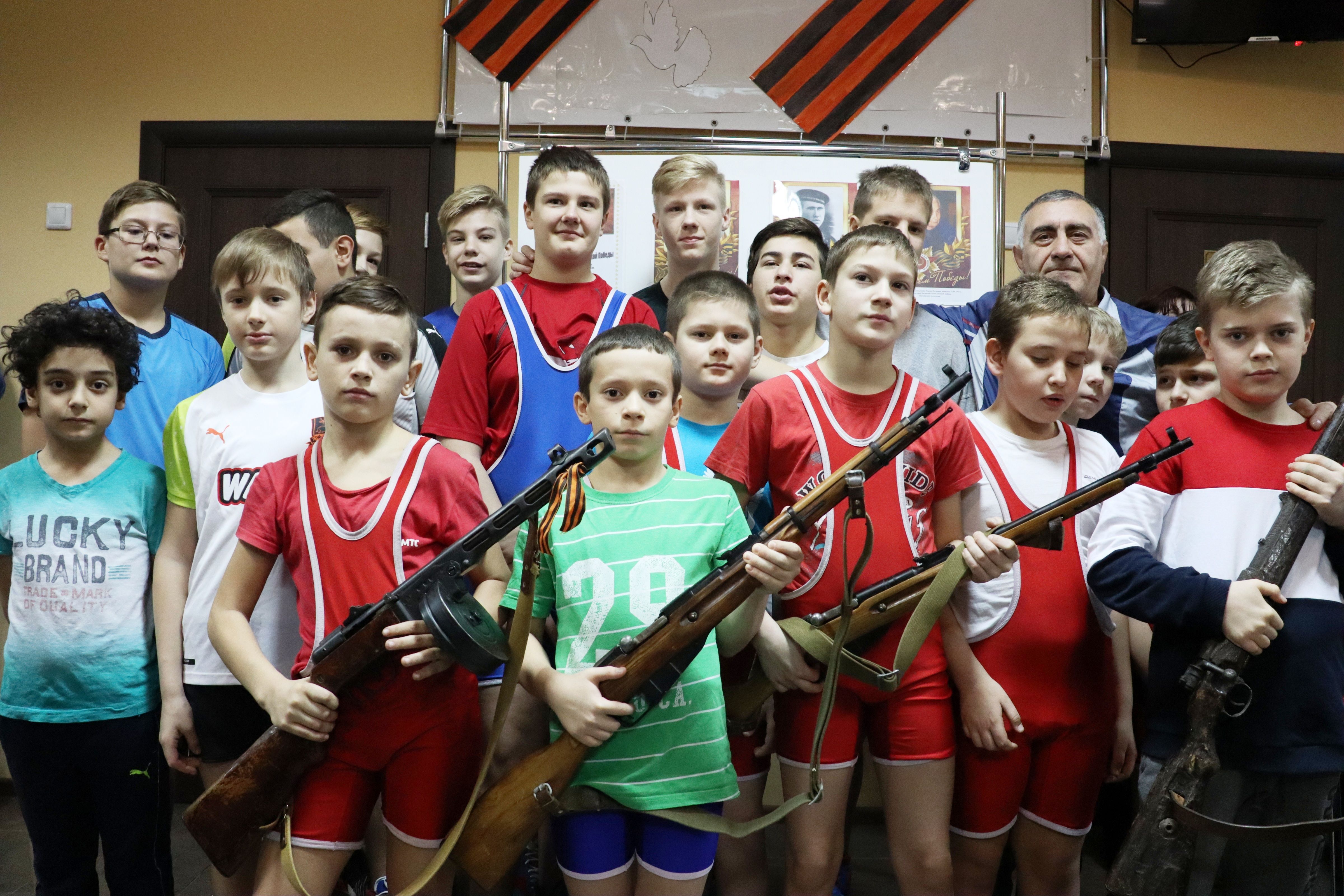 Учащиеся отделений кикбоксинга, бокса, спортивной борьбы СШ № 1 с большим интересом рассматривали экспонаты выставки, задавали вопросы экскурсоводу, фотографировались с оружием.