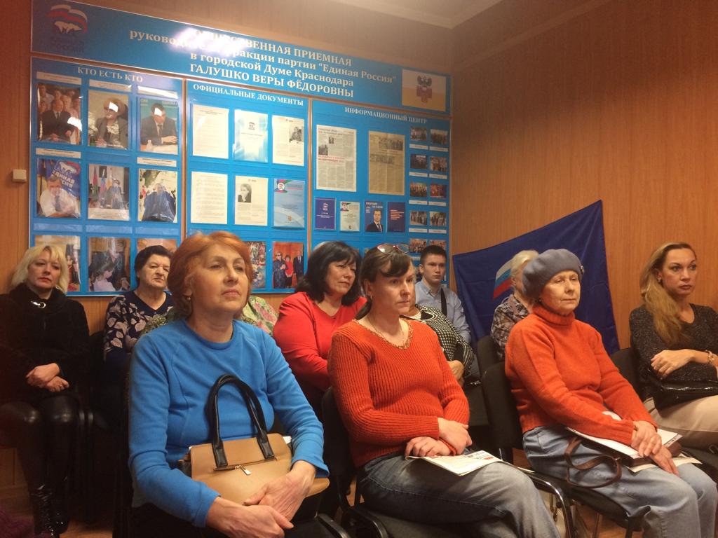 15 февраля 201914 февраля 2019 года в приемной председателя Городской Думы Краснодара Веры Федоровны Галушко состоялся отчет о работе фракции партии «Едина Россия» в Городской Думе перед представителями общественности Комсомольского микрорайона – председателями и активистами органов ТОС микрорайона.
