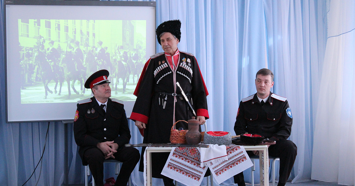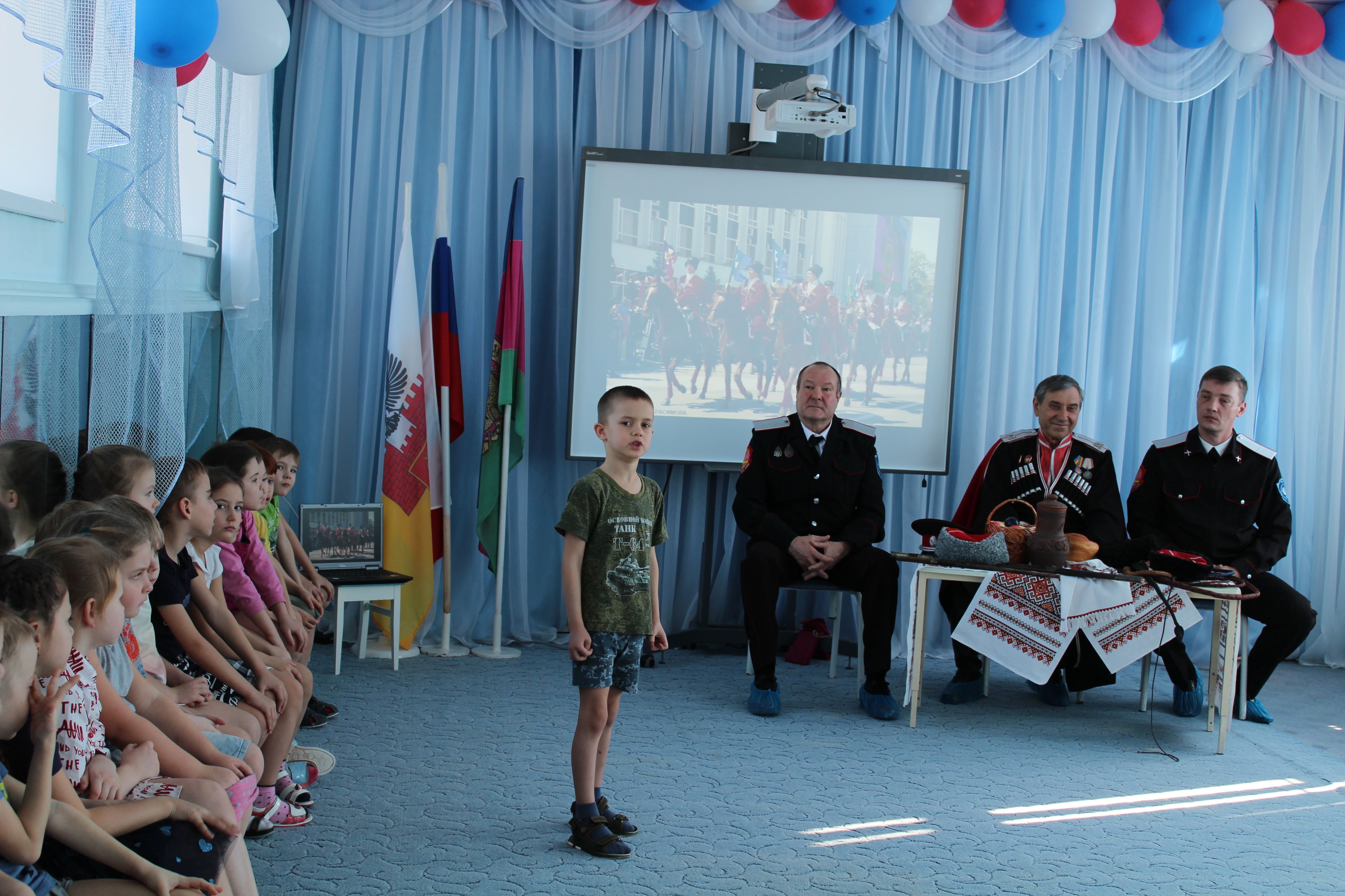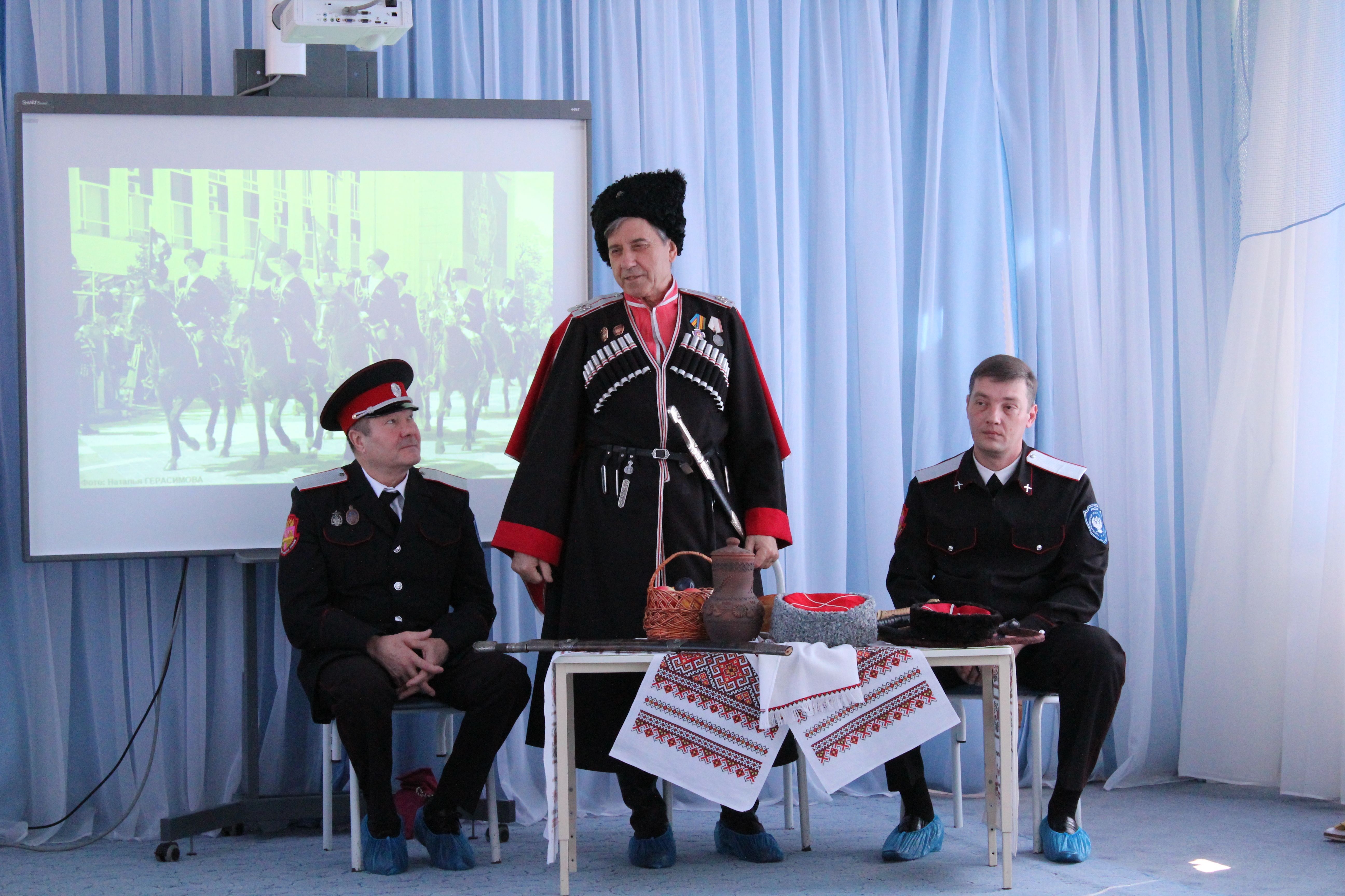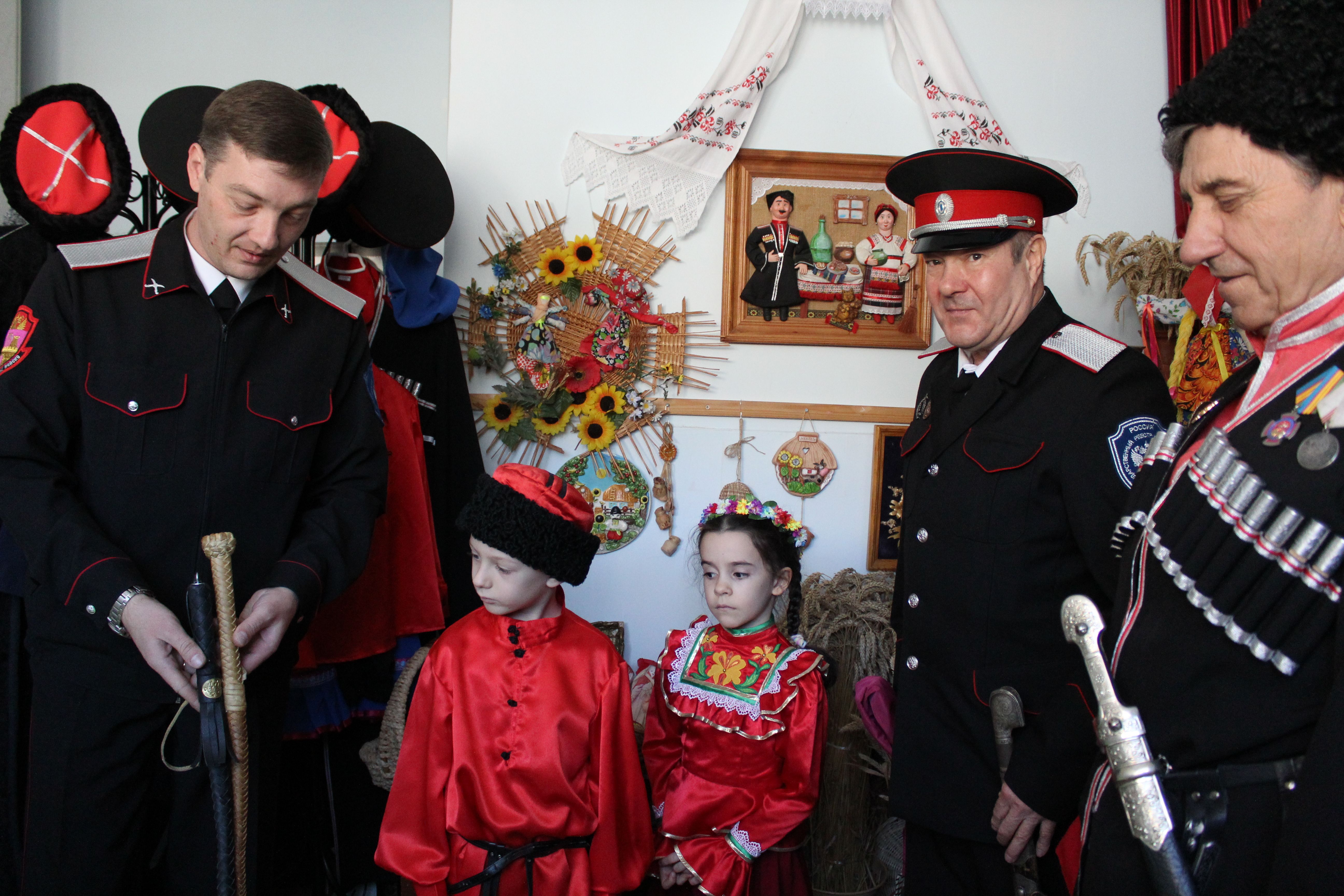 Председатель совета стариков есаул Батычко Станислав Васильевич рассказал ребятам об истории возникновения Кубанского казачьего войска, о первых казаках-переселенцах, о быте и традициях кубанского народа. Казаки Концевой Борис Михайлович и Капустин Константин Владимирович продемонстрировали атрибуты казачьего обмундирования и оружия, рассказали об особенностях службы казаков.