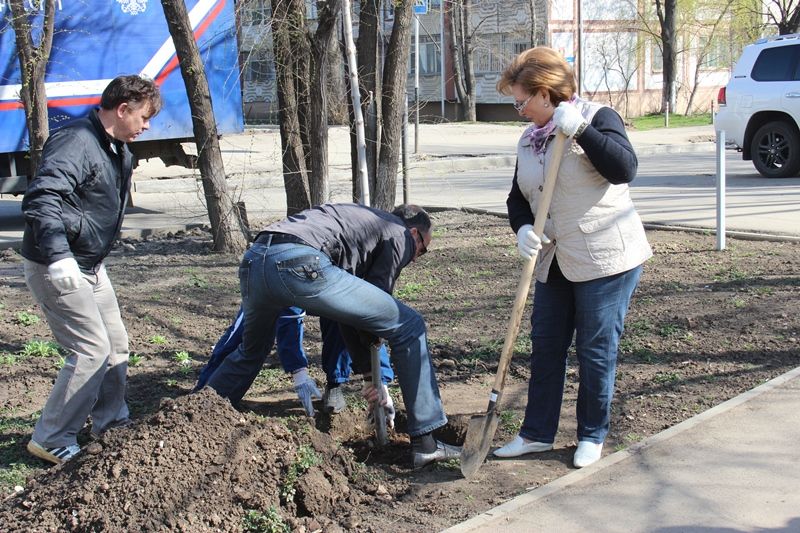 Галина Галушко, председатель городской Думы вместе с Галиной Барабанщиковой, своими помощниками, активистами территориальных центров, сотрудников городской администрации наводили порядок в микрорайоне, сажали деревья, приводили в порядок газоны и клумбы.