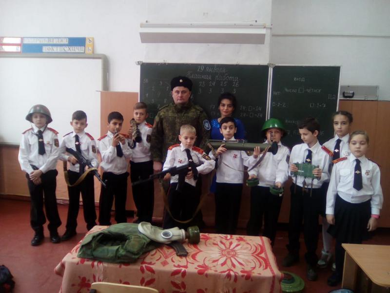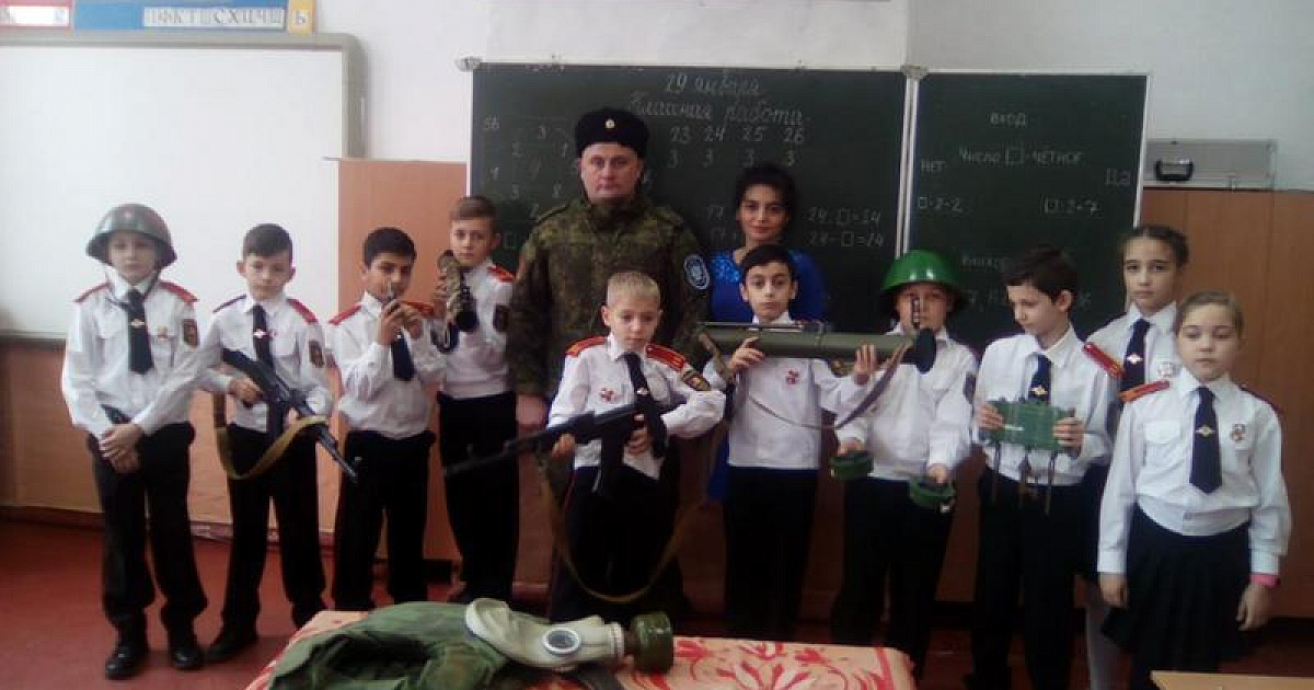 31 января 2019В ходе урока мужества, проводимого в рамках окружного месячника оборонно-массовой работы, казак-наставник Екатеринодарского районного казачьего общества ознакомил с современным вооружением и средствами защиты учеников казачьего класса средней образовательной школы №86 станицы Старокорсунской.