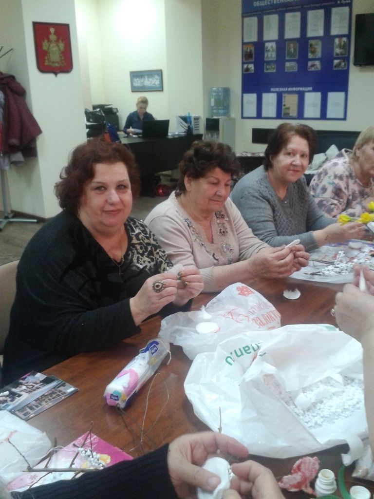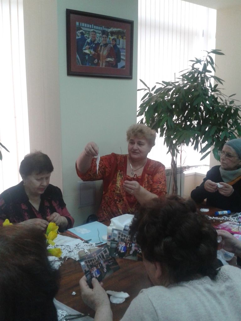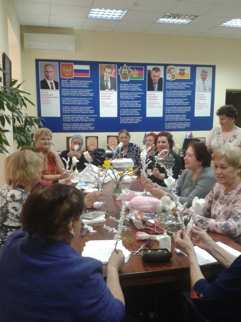 В приёмной депутата ЗСК Дмитрия Викторовича Ламейкина прошло очередное заседание Клуба «Люблю тебя я, град казачий!». На этот раз члены Клуба не столько слушали, сколько работали. Активный участник всех наших мероприятий Наталья Андреевна Симанкова провела мастер-класс по изготовлению подарков к предстоящему празднику – Международному женскому дню 8 марта. Из подручных материалов (ватные диски, кусочки проволоки, пенопласт, клей и краски) мы учились делать веточки мимозы и маки, так любимые на Кубани! Занятие, на первый взгляд, не сложное, но мы так старались сделать свои первые экземпляры красивыми, так усердно работали, что не заметили, как пролетело время, и пришла следующая группа желающих. Интересно было всем! Мы даже забыли о своём возрасте, о дожде, который шумел за окном, о проблемах и давлении, волновавшем нас ещё утром.