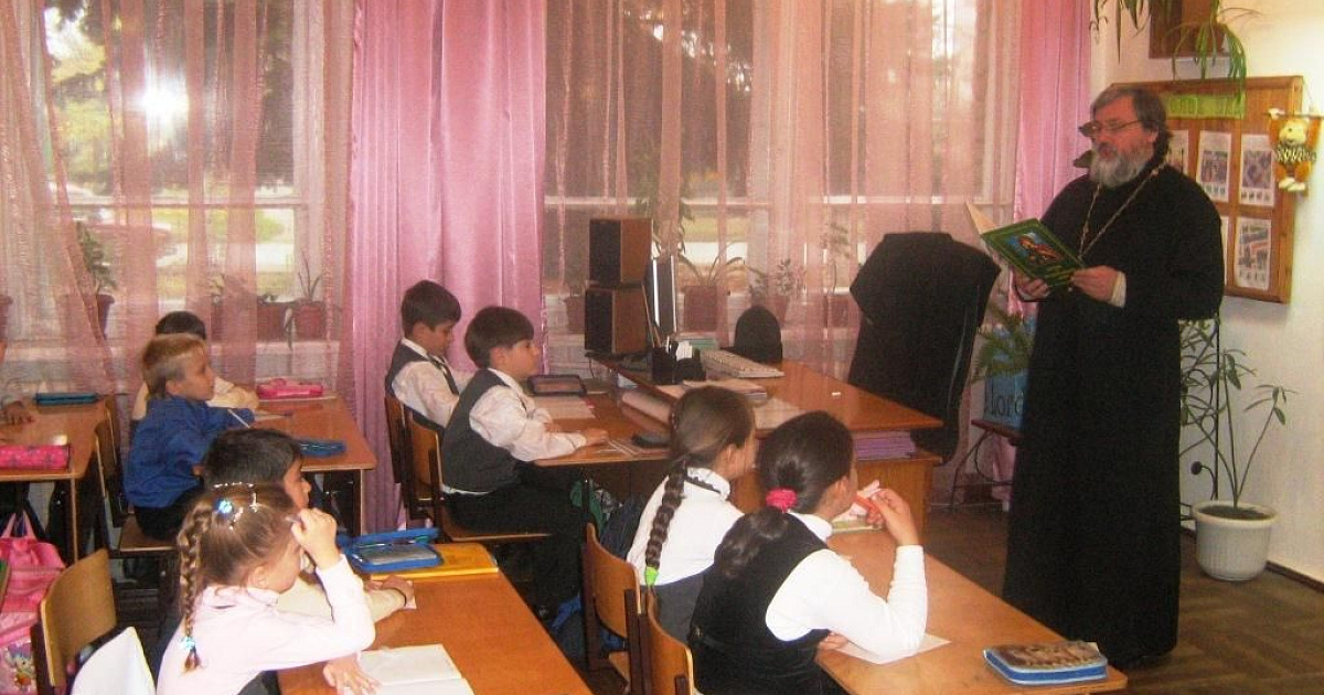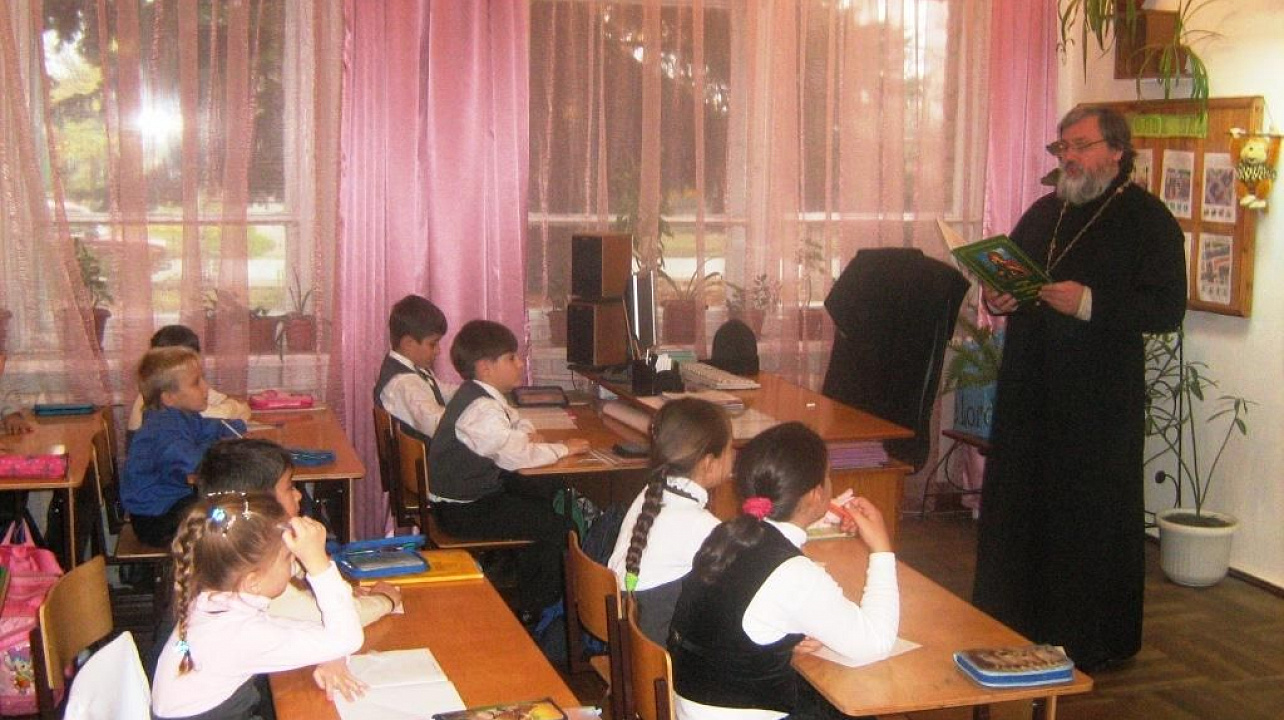 В прикубанской школе №67 прошел традиционный урок патриотизма, который провели служители местного храма отец Владимир и матушка Наталья.