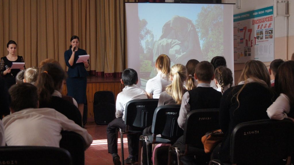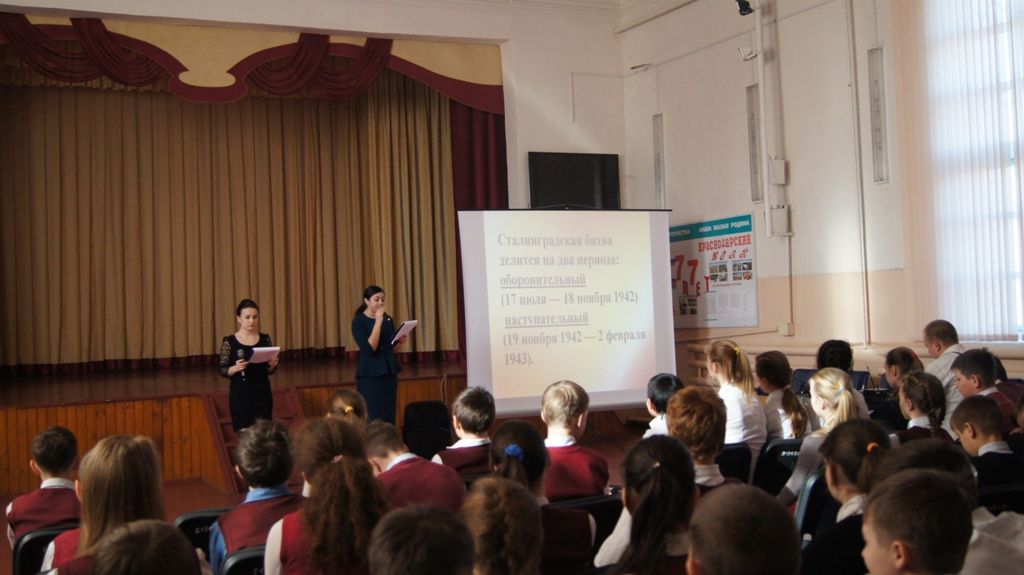 Рассказ ведущих сопровождали музыкальные материалы и презентация которые помогли ребятам, учащимся МБОУ ООШ № 79 п. Копанского во времена Великой Отечественной войны. Вместе с ведущими «побывали» на Мамаевом кургане в годы Великой Отечественной войны, познакомились с операцией «Уран».
