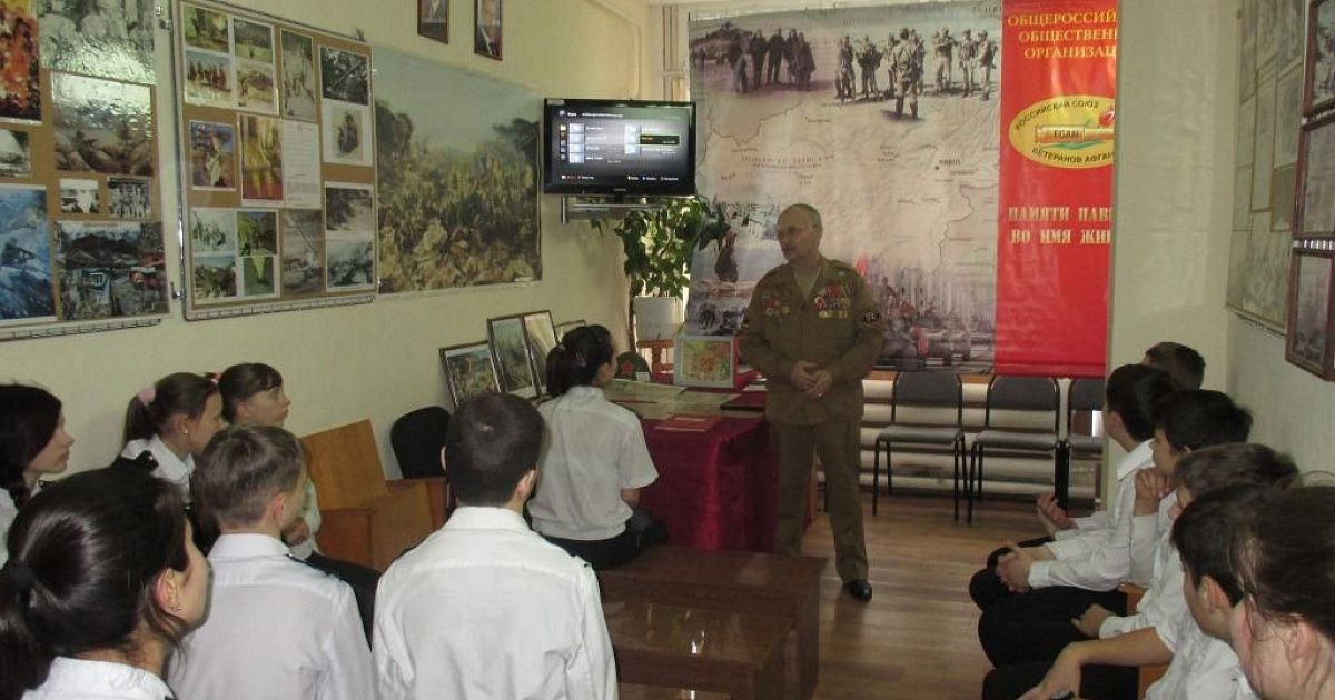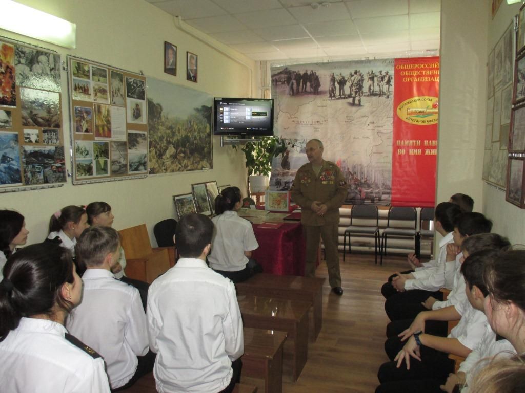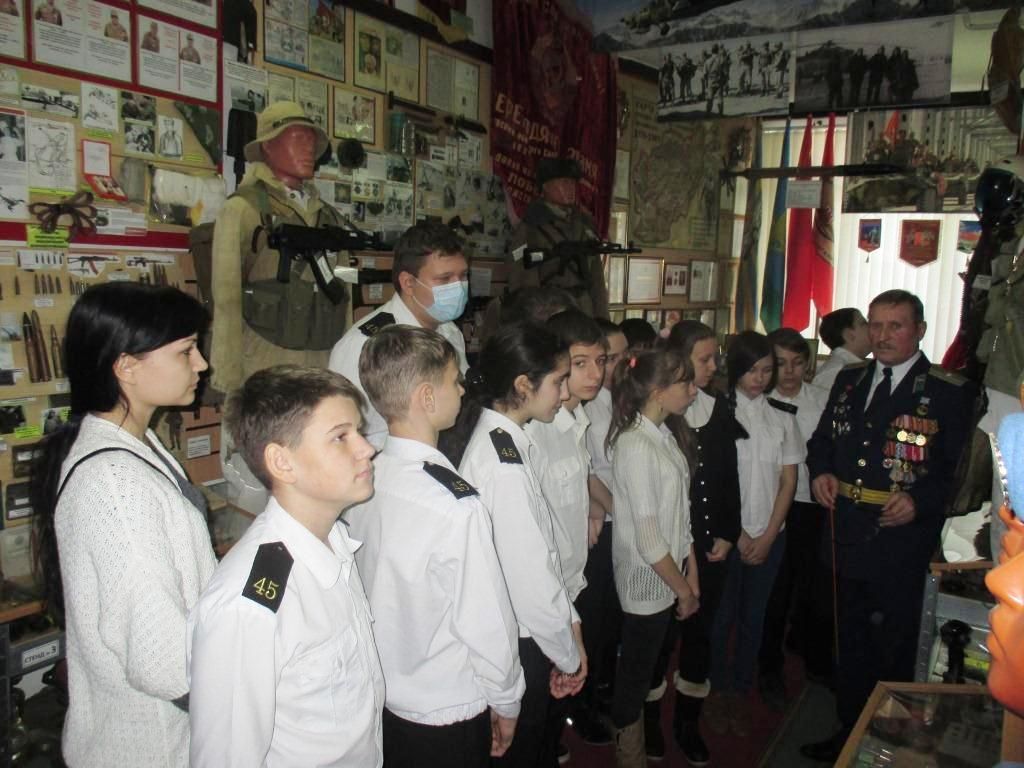 В рамках месячника по оборонно-массовой и военно-патриотической работе в Прикубанском окружном отделении г.Краснодара КРО ООО «Российский Союз ветеранов Афганистана» прошел урок патриотического воспитания для учащихся 8-А класса МБОУ СОШ № 45. Ученики, более 20 человек, со своим преподавателем Щекиной Н.А., встретились с ветеранами боевых действий в Афганистане Золочевским П.В. и Таратыновым Н.Г. Во время беседы ребятам показали видеохронику, затем провели экскурсию в музее «Боевой Славы».