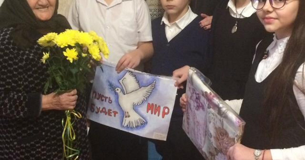 В годы войны Людмила Порфировна жила в Грузии, где работала дояркой на ферме. Мальчики и девочки, пришедшие в гости, с интересом выслушали рассказ Людмилы Гягяевой о жизни в военное время и подарили на память заранее подготовленные рисунки.