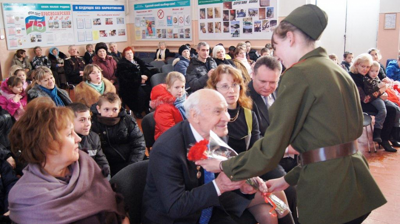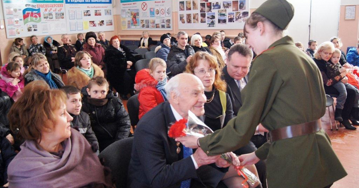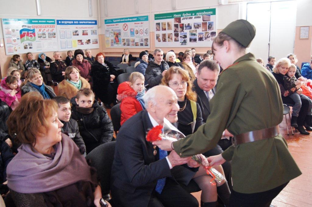 Совместное мероприятие МБУК СДК х. Копанского и основной общеобразовательной школы №79 состоялось в сельском доме культуры. На встречу со школьниками и жителями хутора пришли ветеран войны Михаил Георгиевич Малахов, заместитель главы Прикубанского внутригородского округа Татьяна Григорьевна Фролова, глава Берёзовского сельского округа и другие.