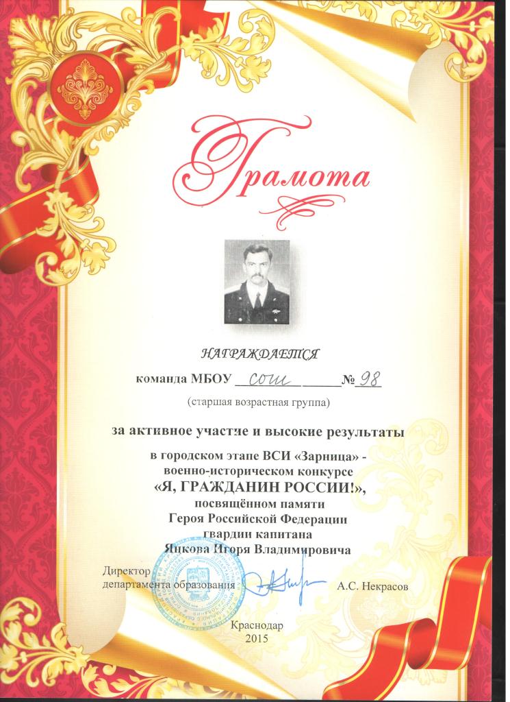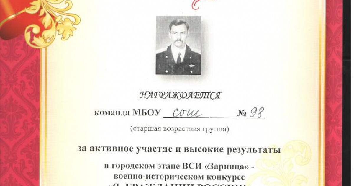 Мухина Анна, Меньшикова Анастасия, Лашин Владислав, Изюмский Олег, Кушнарева Анна, Скакунова Виктория. Ребята заняли 1 место в округе и 4 место на городском этапе в военно-патриотическом конкурсе «Я, гражданин России», посвященном памяти Героя Российской Федерации гвардии капитана Янкова Игоря Филипповича. Дети показали высокий уровень подготовки и знаний, отвечая на вопросы исторической викторины, посвященной Великой Отечественной войне.