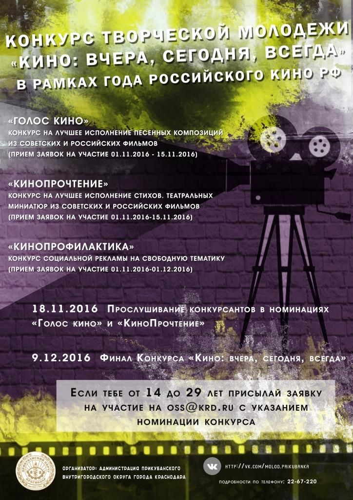 Администрация Прикубанского внутригородского округа города Краснодара и Молодёжный совет при главе окружной администрации приглашают принять участие в конкурсе молодых талантов "Кино: вчера, сегодня, всегда". Работы участников оценит профессиональное жюри, в составе которого представители СМИ, кинокритики, педагоги дополнительного образования. Победителей и призёров финального этапа ждут ценные призы.