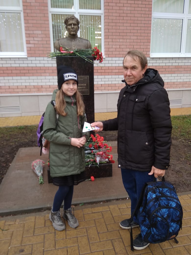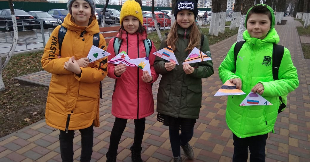 Вместе с активистами района школьники роздали «треугольники»» всем, кто сегодня принял участие в возложениях цветов к бюстам Героев, которые недавно были открыты на районе.