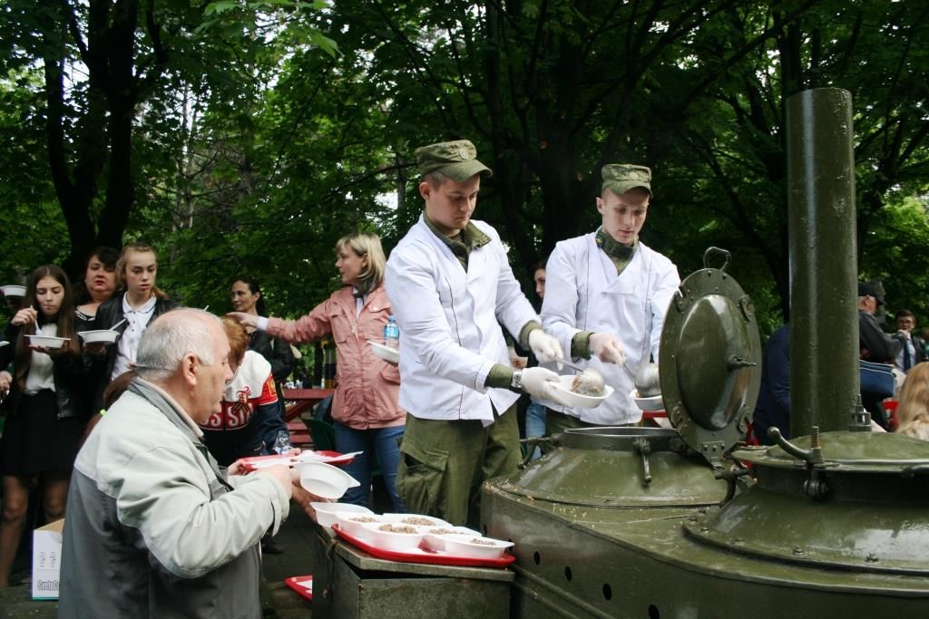 В заключение праздничной программы, по доброй традиции в округе, ветеранов угостили вкусной солдатской кашей. На раздаче полевой кухни поработали военнослужащие Краснодарского высшего военного авиационного училища лётчиков имени А.К. Серова.