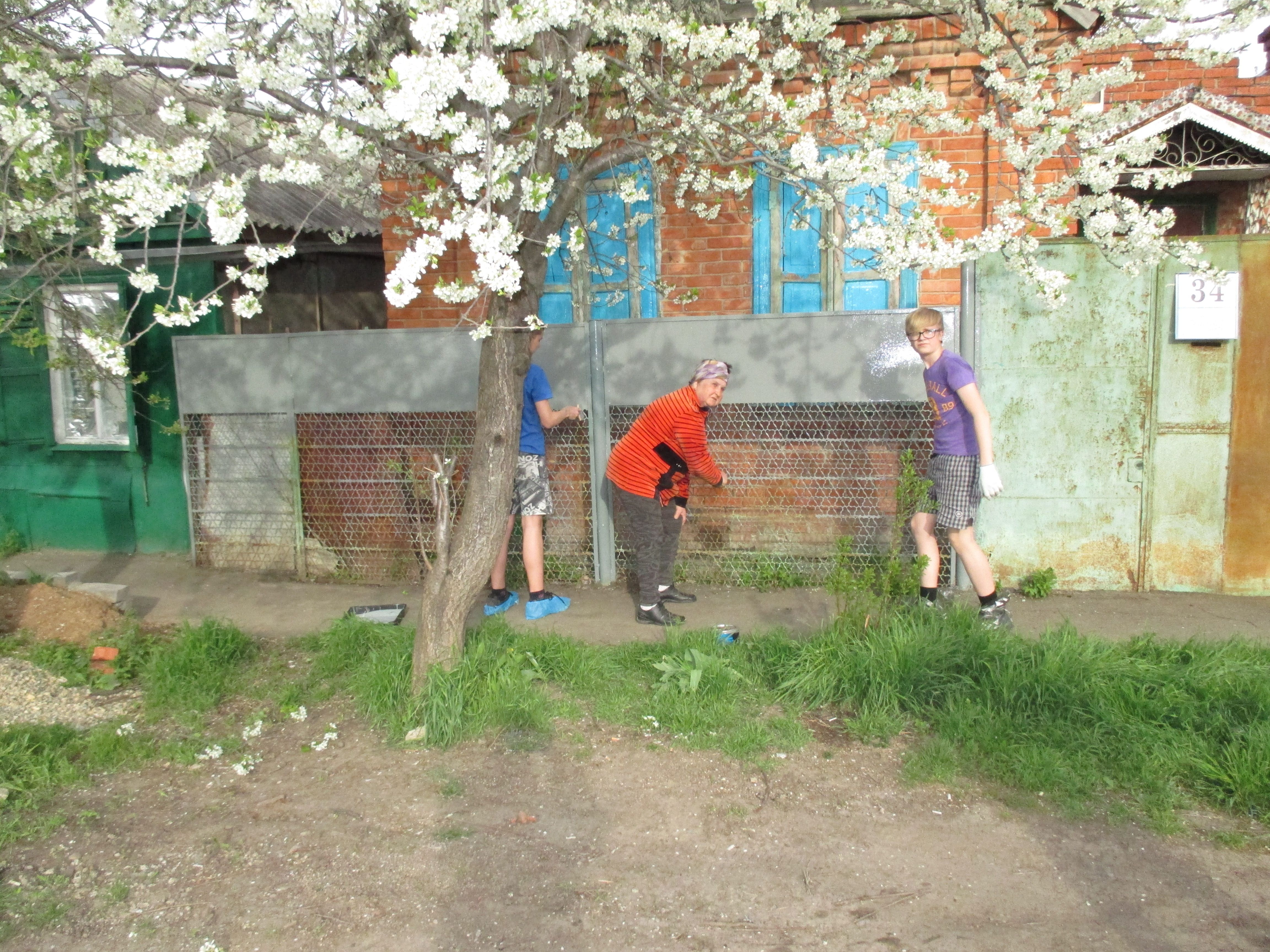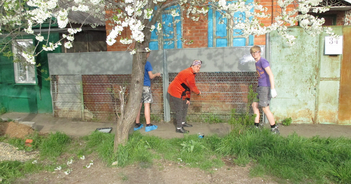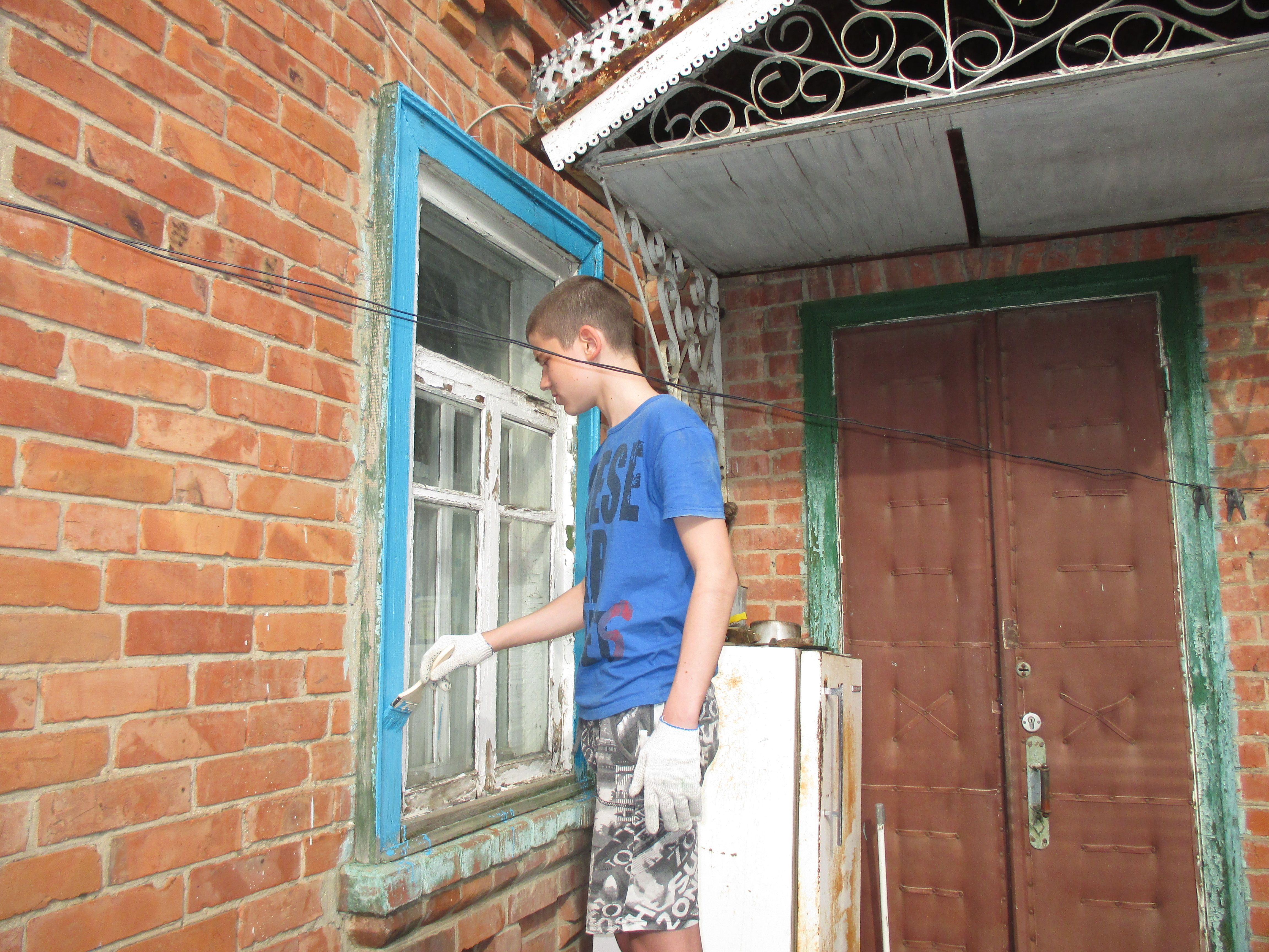 Помощниками Натальи Дмитриевны стали учащиеся 8Б класса СОШ №63 Александр Гребенников и Даниил Запорожцев. Дружная команда, орудуя специальными инструментами, подготовила к покраске окна, ставни и забор.
