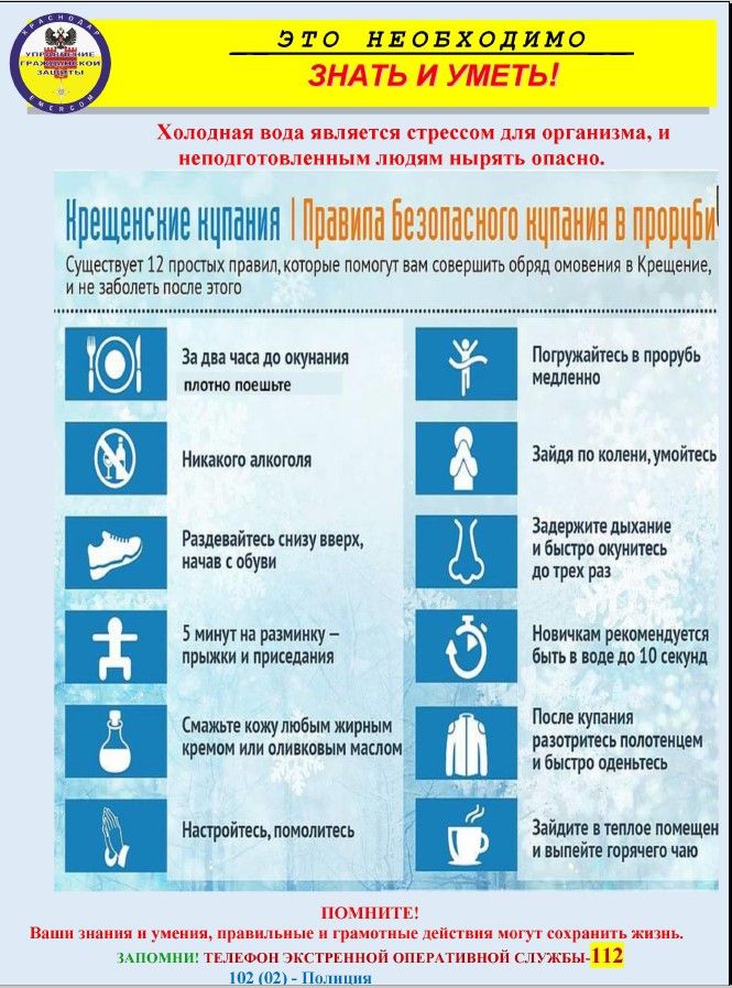 Традиция купания в ледяной проруби в Крещенскую ночь существует очень давно. Желающим приобщиться к ней необходимо помнить несколько простых правил безопасности, которые помогут сохранить здоровье после Крещенских купаний.
