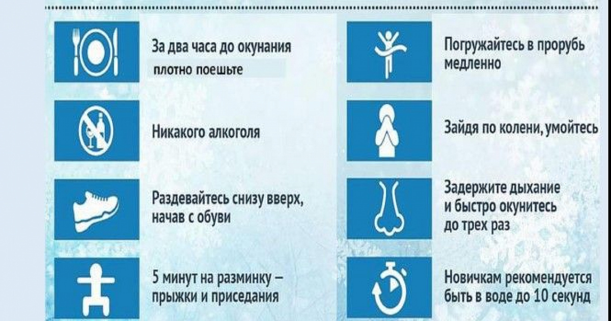 1. За час до купания следует плотно поесть, можно выпить ложку рыбьего жира. Перед заходом в ледяную воду необходимо обязательно разогреться, сделать небольшую разминку или пробежку. Но нельзя заходить в воду вспотевшим.