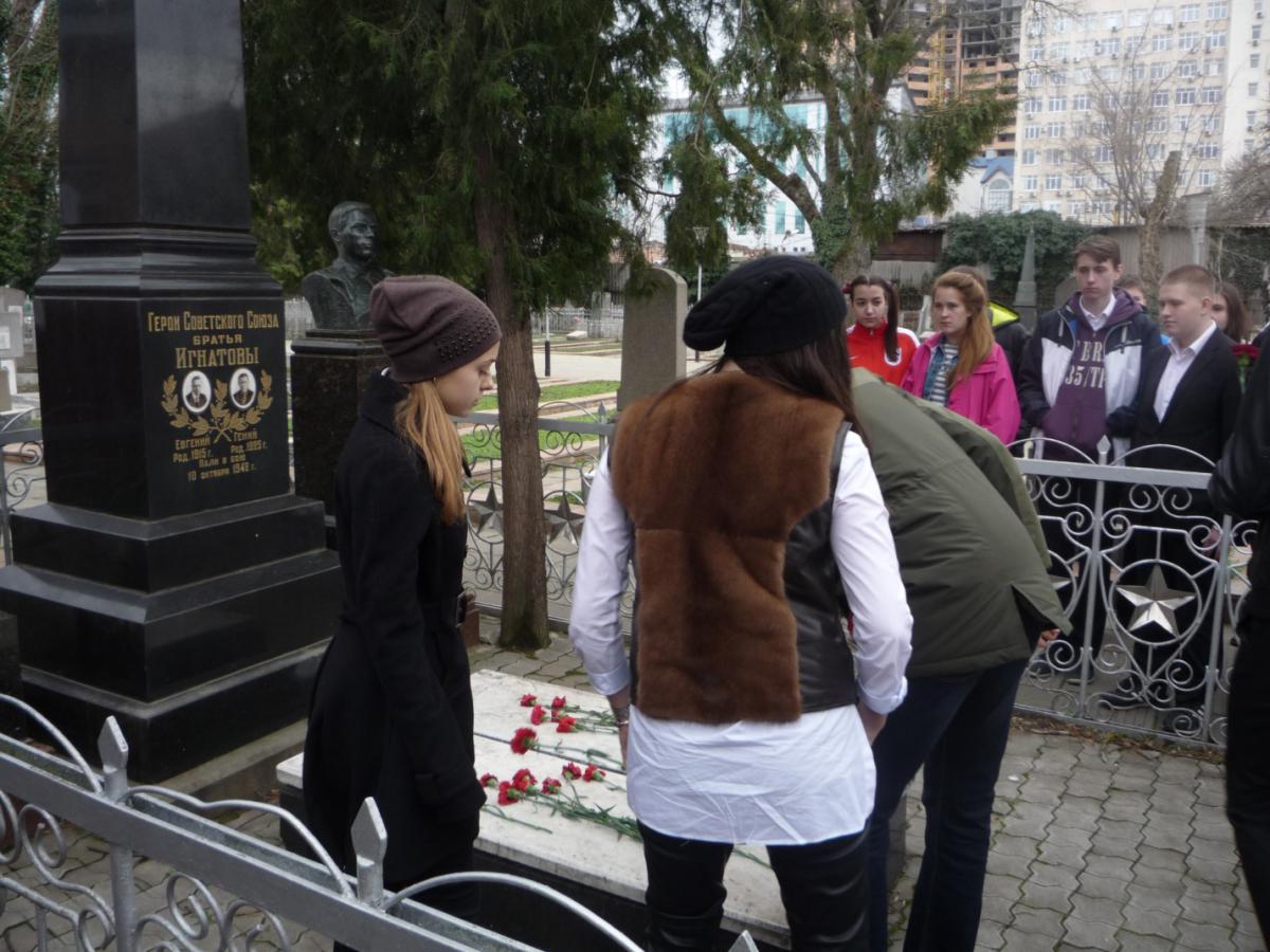 Побывали в сквере п. Пашковского, где создан мемориал защитникам города, на братской могила летчиц, погибших в 1943 году при освобождении Кубани. Почтили память павших на площади Павших Героев, на могиле братьев Игнатовых и В. Головатого.