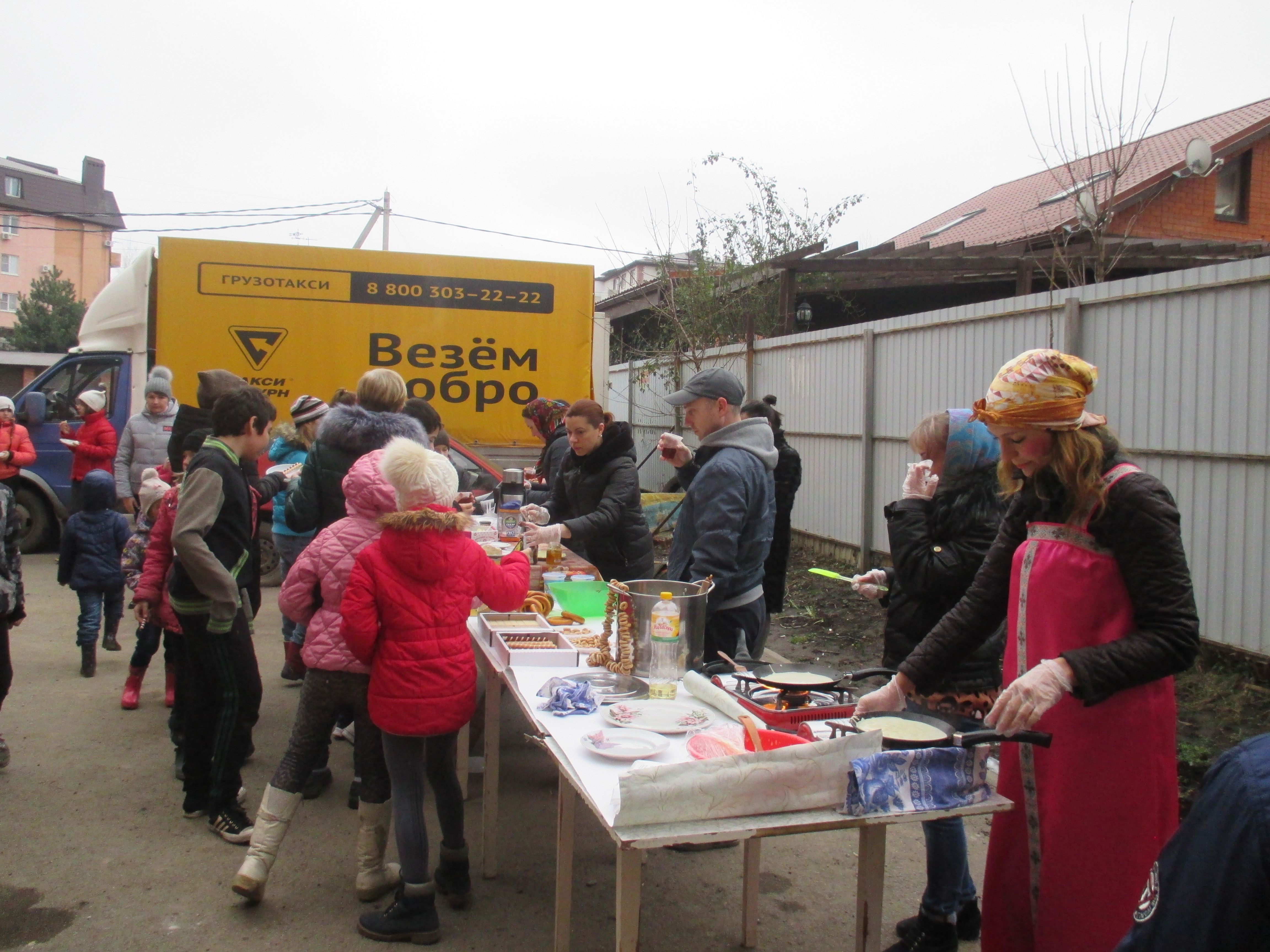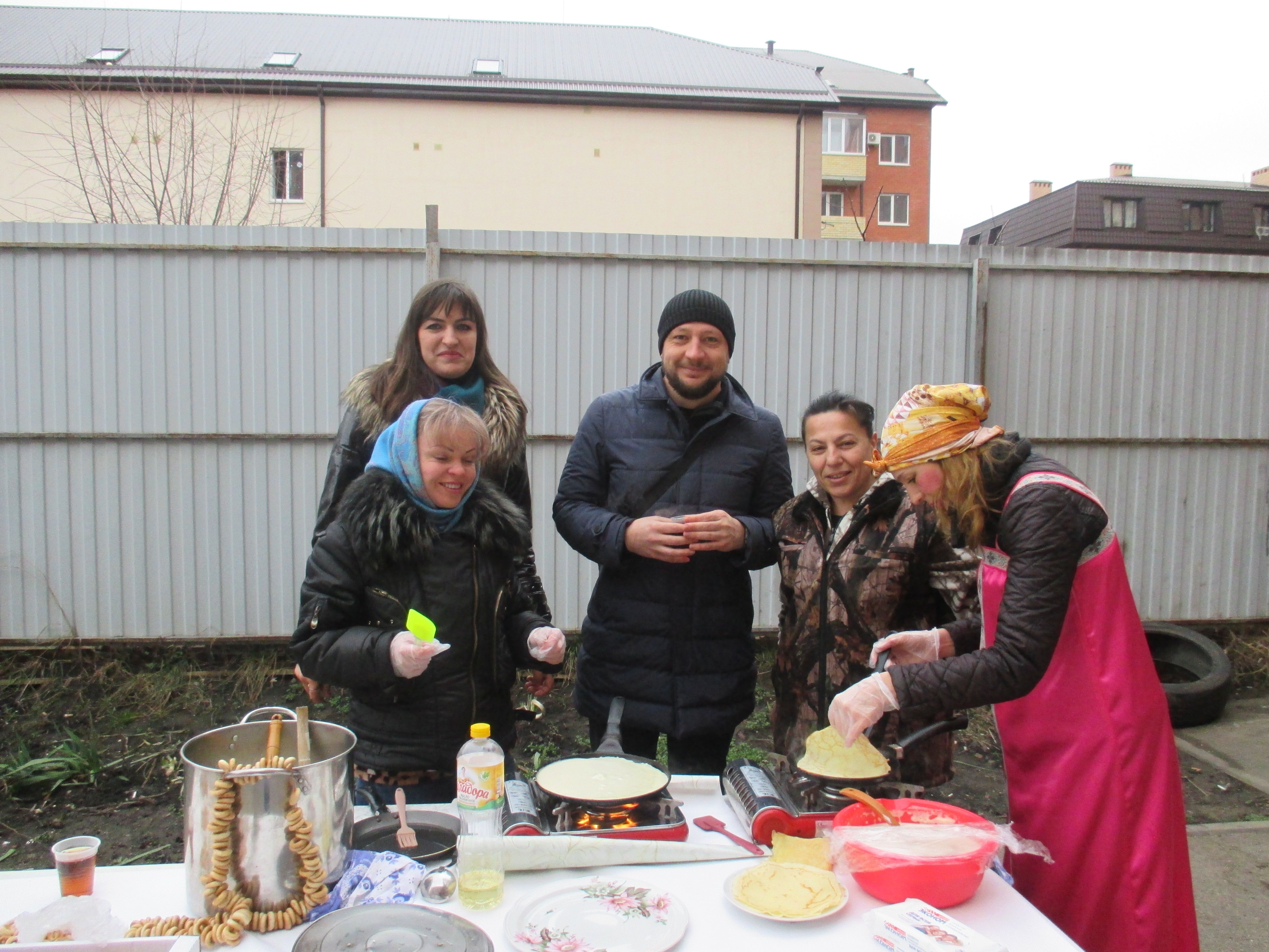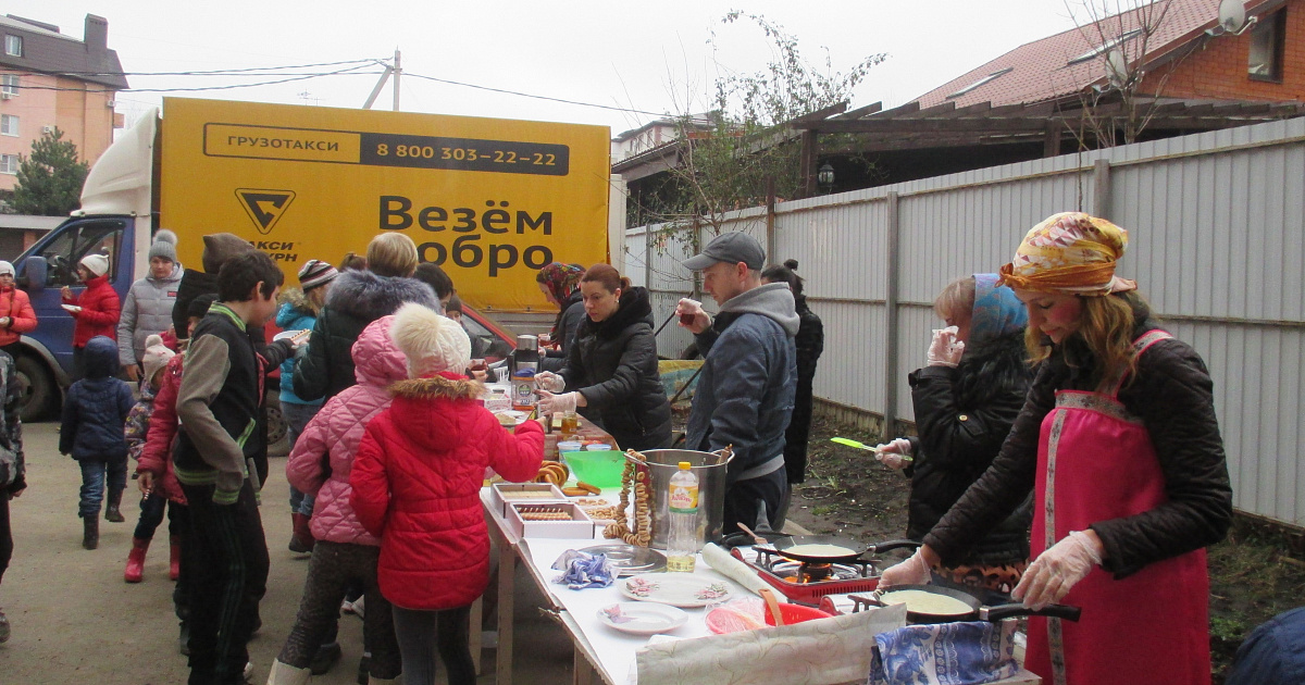 Согласно старинной русской традиции он носит название Масленица. Возле дома №11 по улице Атамана Бабыча расположились столы, где все желающие могли продегустировать выпечку, сладости, мед и отведать горячие блины с разной начинкой. Взрослые и дети с азартом принимали участие в игровых забавах, которыми руководил веселый Мишка, а затем состоялось театрализованное представление, на котором сожгли чучело Масленицы.