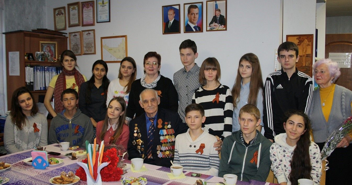 Ребята встретились с ветераном Великой Отечественной войны и труда, сыном полка, заслуженным строителем России Хархардиным Анатолием Ивановичем, который уже в 11 лет заслужил медаль за боевые заслуги в боях против Японии. Встреча состоялась в приемной депутата Городской Думы Краснодара Е.А. Егорова. Анатолий Иванович подробно рассказал, почему ушел на фронт в детском возрасте.