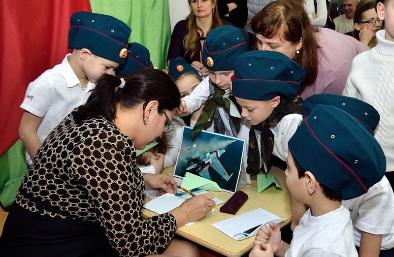 Тут же проходила выставка орденов и медалей, детских рисунков, военных фотографий, - все это создавало торжественную и патриотическую атмосферу.