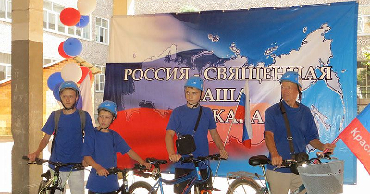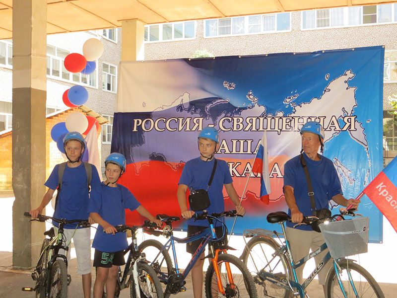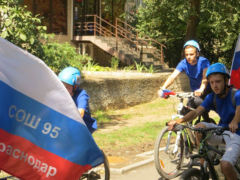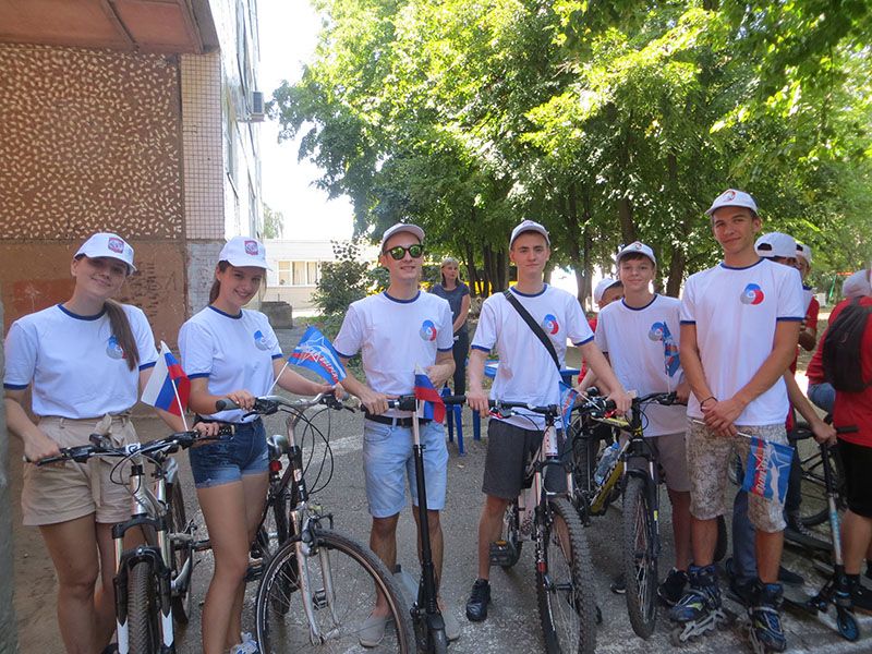 Все ребята в единой форме, в майках с эмблемами, бейсболках на велосипедах гироскутерах, роликах и сигвеях, украшенные флагами России направились яркой дружной колонной до сквера «Фестивальный».
