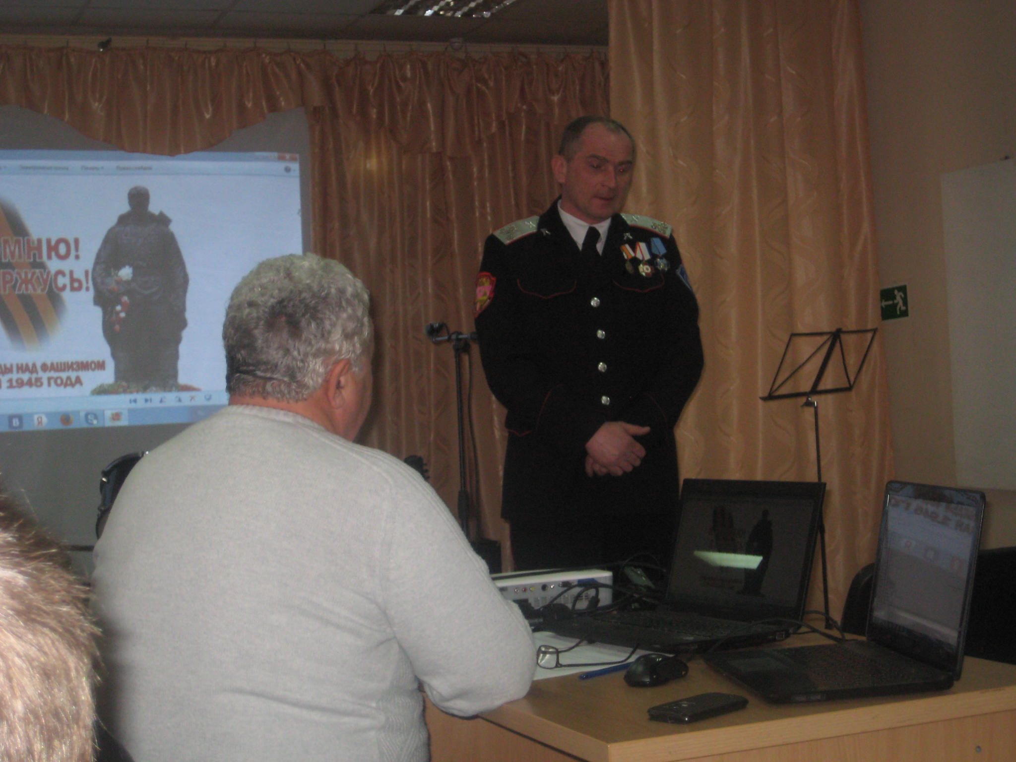 Учащиеся школы №68 приняли участие в этом мероприятии. Перед присутствовавшими выступили атаман ХКО «Курень Колосистый» Каданин В.А., ветеран вооружённых сил Житомирский Б.А., прозвучали стихи и песни военной тематики.