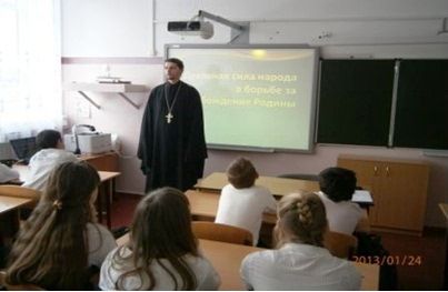 Настоятель храма Покрова Пресвятой Богородицы провел для учащихся средних классов лекцию на тему «Духовная сила народа в борьбе за независимость Родины». Отец Александр рассказал ребятам о деятельности Русской Православной Церкви в годы Великой Отечественной войны. Учащиеся с большим интересом посмотрели документальный фильм «За Веру и Отечество».