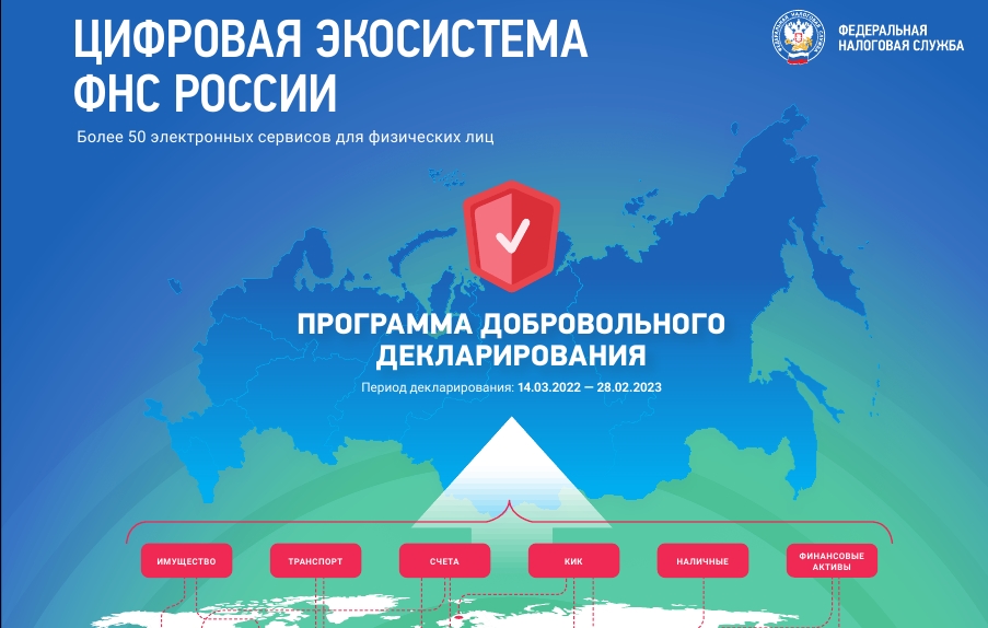 До 28 февраля 2023 года гражданам предоставляется возможность добровольно задекларировать свои счета и вклады в заграничных банках, ценные бумаги, доли участия в иностранных организациях, иные финансовые активы, а также контролируемые иностранные компании.