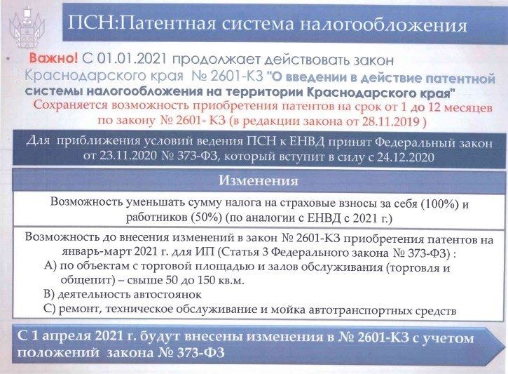 Вышеуказанным законодательным актом налогоплательщикам, применяющим патентную систему налогообложения (ПСН), предоставлено право уменьшать сумму налога, уплачиваемого в связи с применением патента, на страховые платежи (взносы) и пособия по аналогии с имеющимся правом у налогоплательщиков, применяющих ЕНВД.