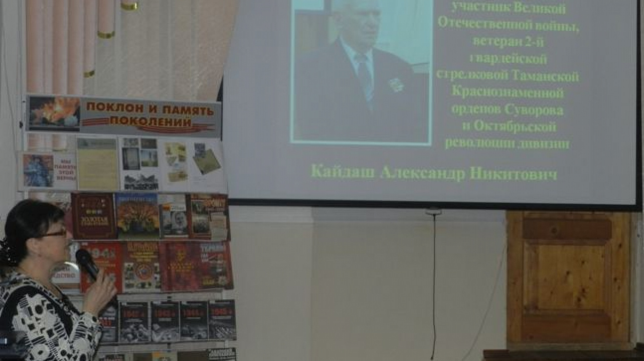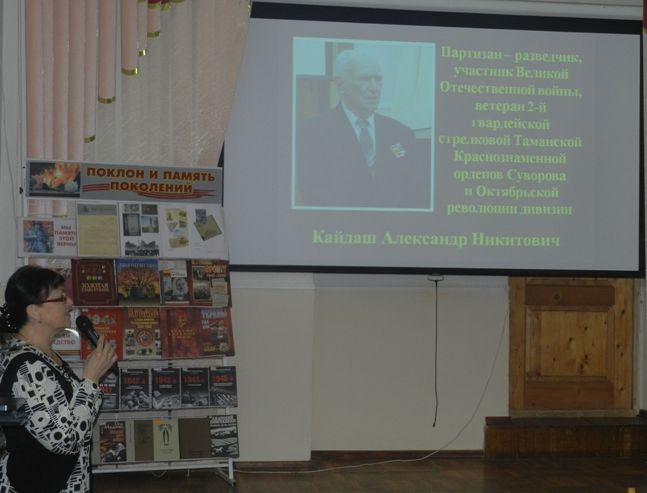 Сотрудники библиотеки подготовили выставку книг и презентацию о жизни– партизана – разведчика, участника Великой Отечественной войны, ветерана 2-й гвардейской стрелковой таманской Краснознаменной орденов Суворова и Октябрьской революции дивизии, награжденного орденами Отечественной войны I-ой Степени, Красной Звезды и медалями "За отвагу", "За боевые заслуги", писателя Александра Никитовича Кайдаша.
