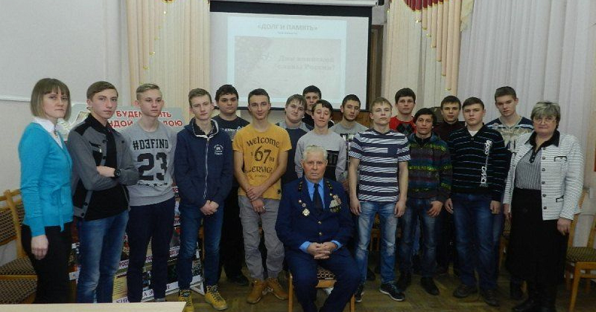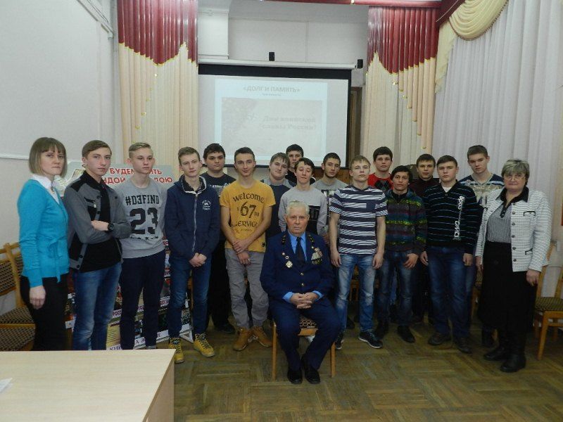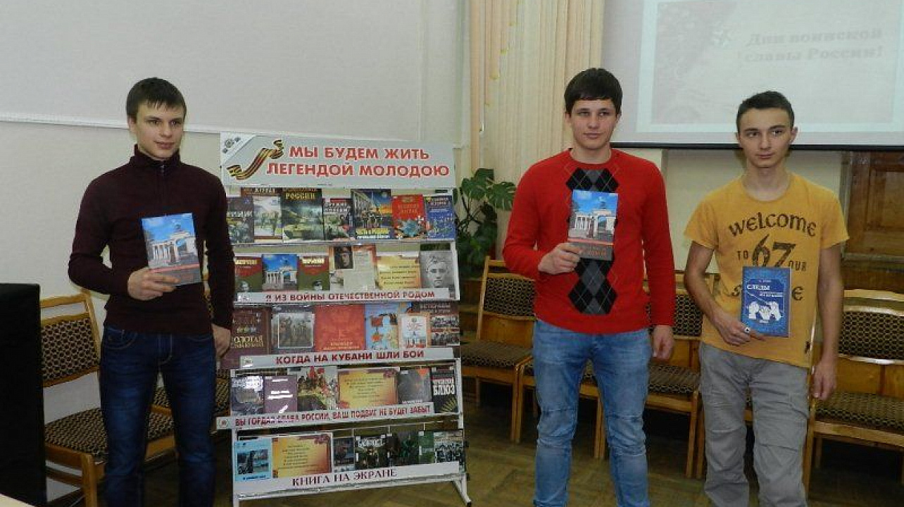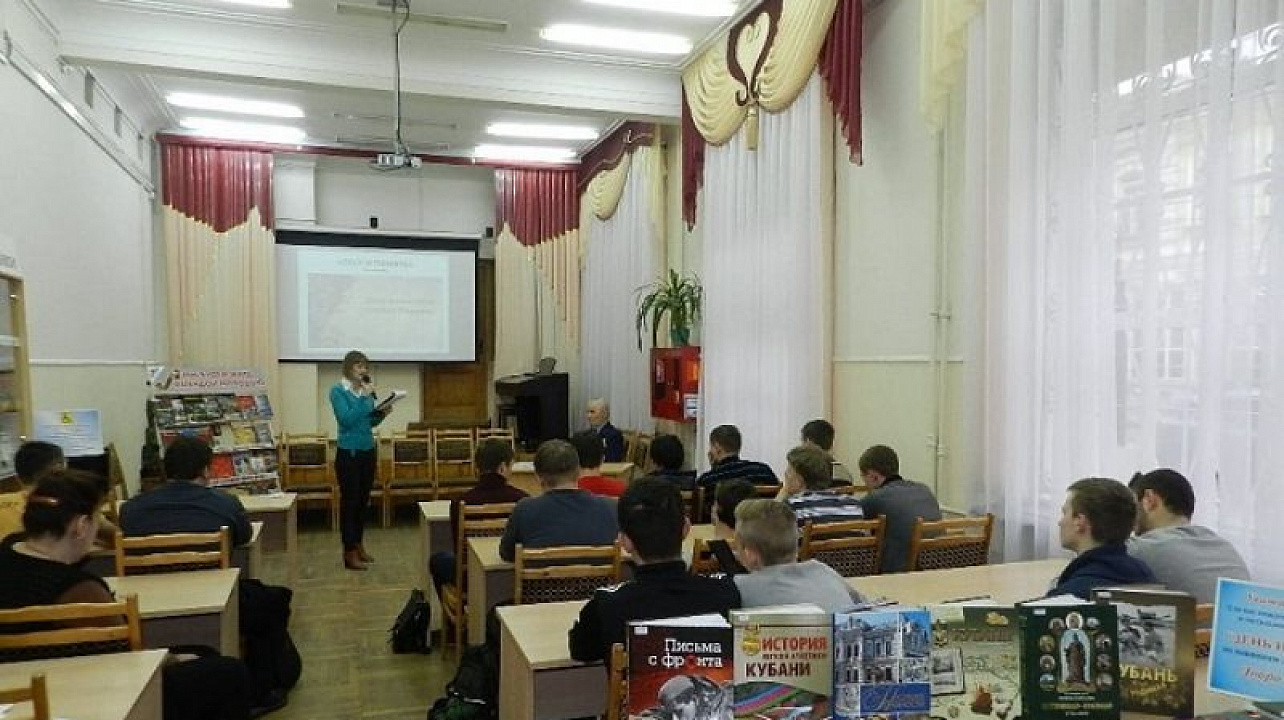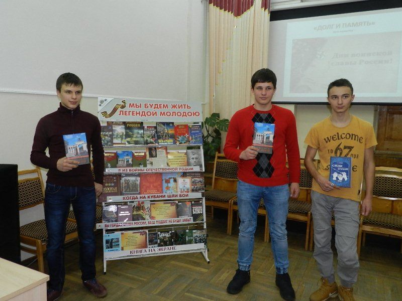 1 февраля 201629 января в рамках месячника оборонно-массовой и военно-патриотической работы сотрудники Центральной городской библиотеки им. Н. А. Некрасова провели урок мужества «Долг и память» для студентов Краснодарского монтажного техникума.