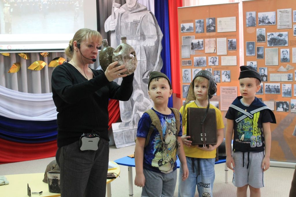 Детям представили мини-музей «Когда была Война», презентацию «Великая Отечественная Война на фотографиях» и фрагмент исторического фильма «Парад Победы в 1945 году».
