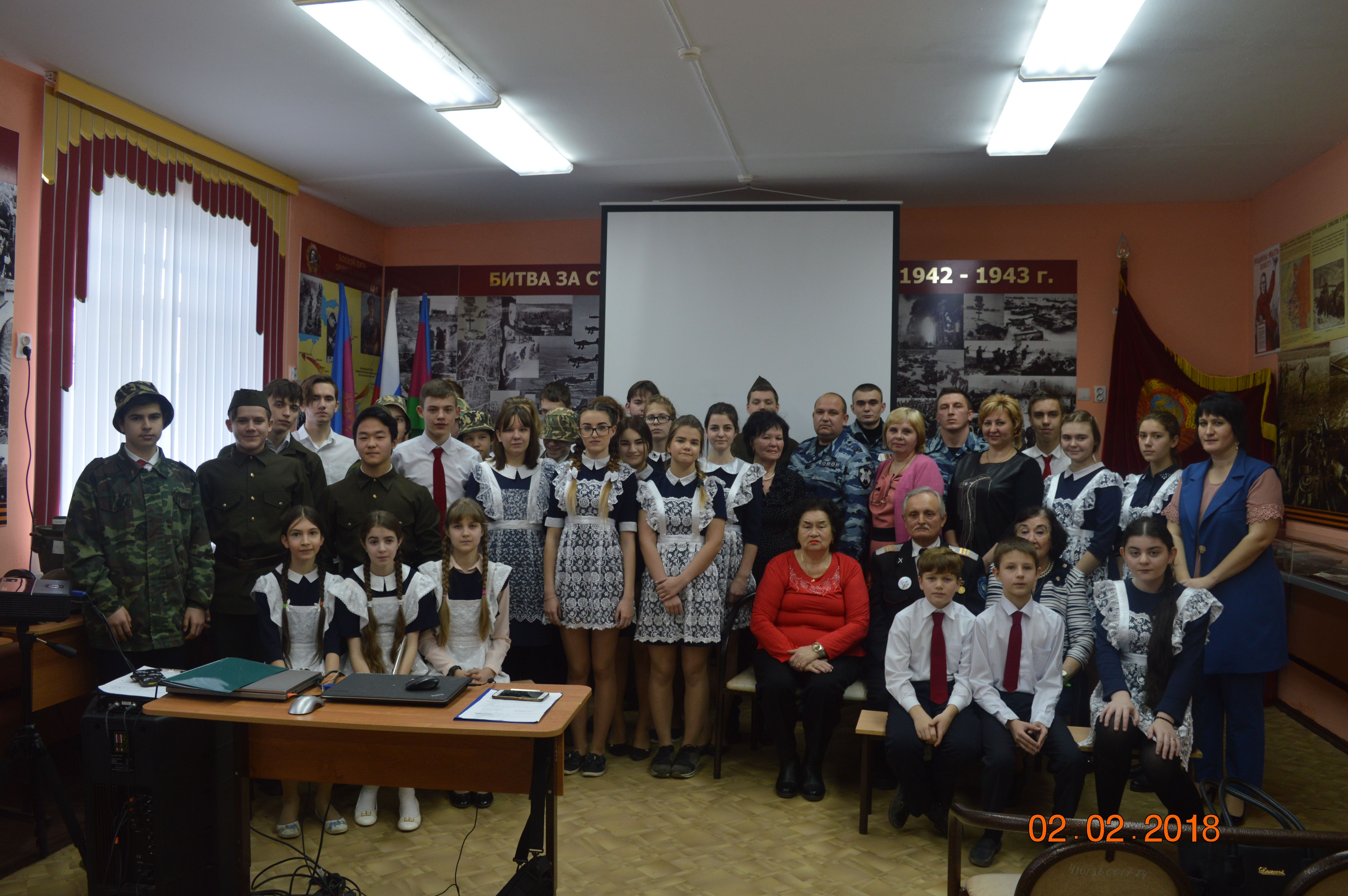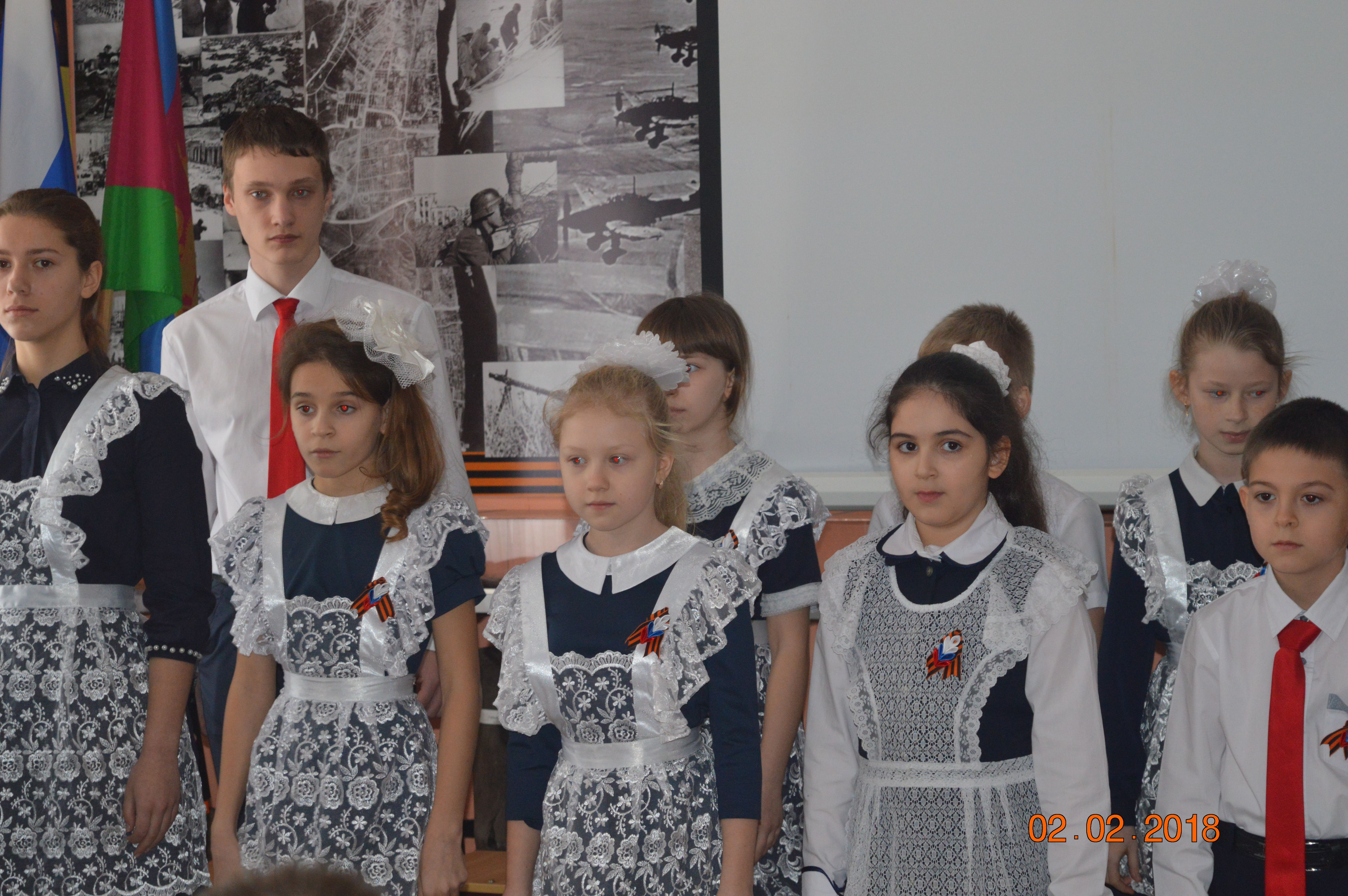 Ребята узнали об историческом сражении, которое состоялось 2 февраля 1943 года под городом Сталинградом. О боях, проходивших на территории города, его героической обороне, наступлении немецкой армии. С благодарностью вспомнили наших земляков — участников Сталинградской битвы Василия Калиновича Коцаренко, Владлена Павловича Лапина, Владимира Сергеевича Суханова, Лилию Богдановну Косякову и других ветеранов.