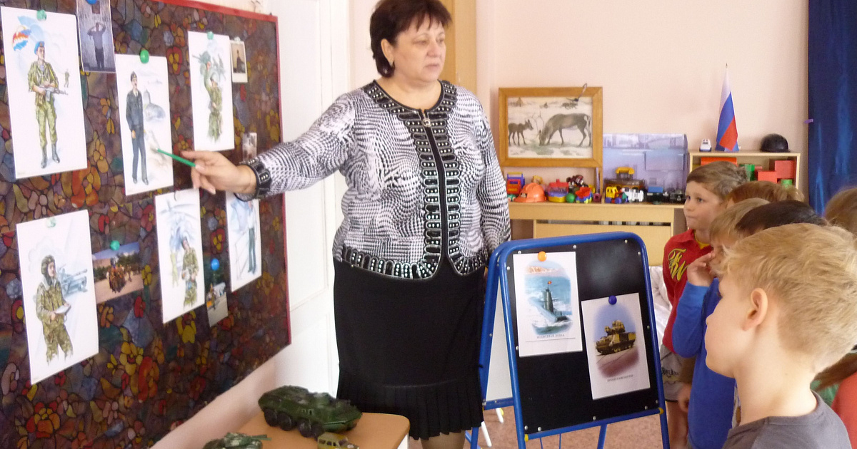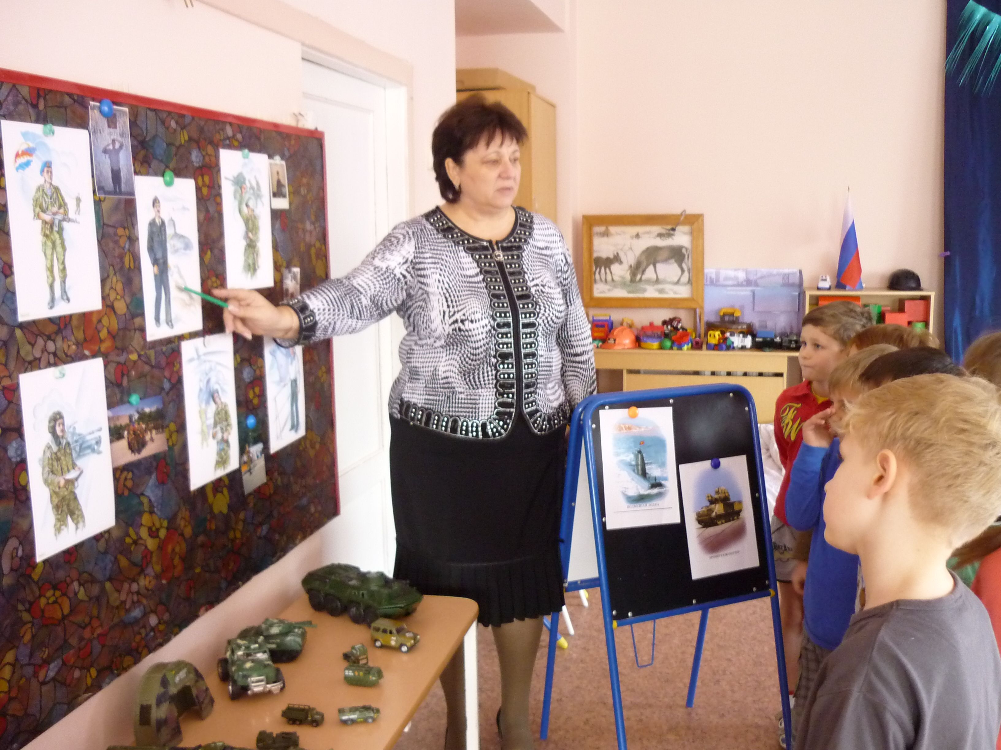 Дети с большим интересом рассматривали альбомные иллюстрации о родах войск, слушали рассказы педагогов о войне и военные песни.