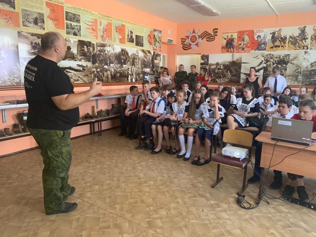 Урок мужества посвятили грядущей 75-й годовщине Дня Победы в Великой Отечественной войне Учащиеся гимназии осмотрели интерактивную выставку, на которой представлены артефакты времен Великой Отечественной войны. Павел Боровиков,руководитель отряда, рассказал об истории появления отряда, поисковой работе и увековечивании памяти павших, а так же малоизвестные факты о сражениях в годы ВОВ на территории Краснодарского края. Курсанты отряда рассказали ребятам о том, чем занимается отряд, поделились воспоминаниями об участии в патриотических мероприятиях и экспедициях.