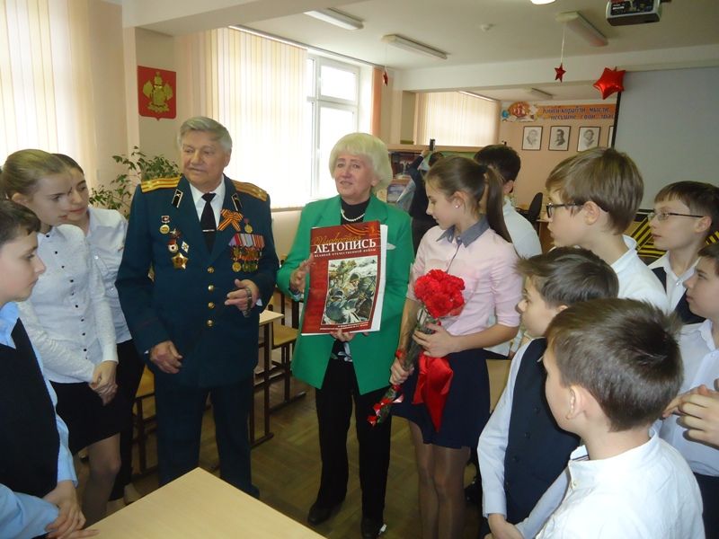 Достойным украшением стала Георгиевская лента, изготовленная старшеклассниками школы. Георгий Поликарпович поведал ребятам о битве под Сталинградом, о военном деле и стойкости русских солдат. Мария Александровна Иванова, руководитель ветеранской организации подарила будущему музею боевой славы Плакатную летопись Великой Отечественной войны.