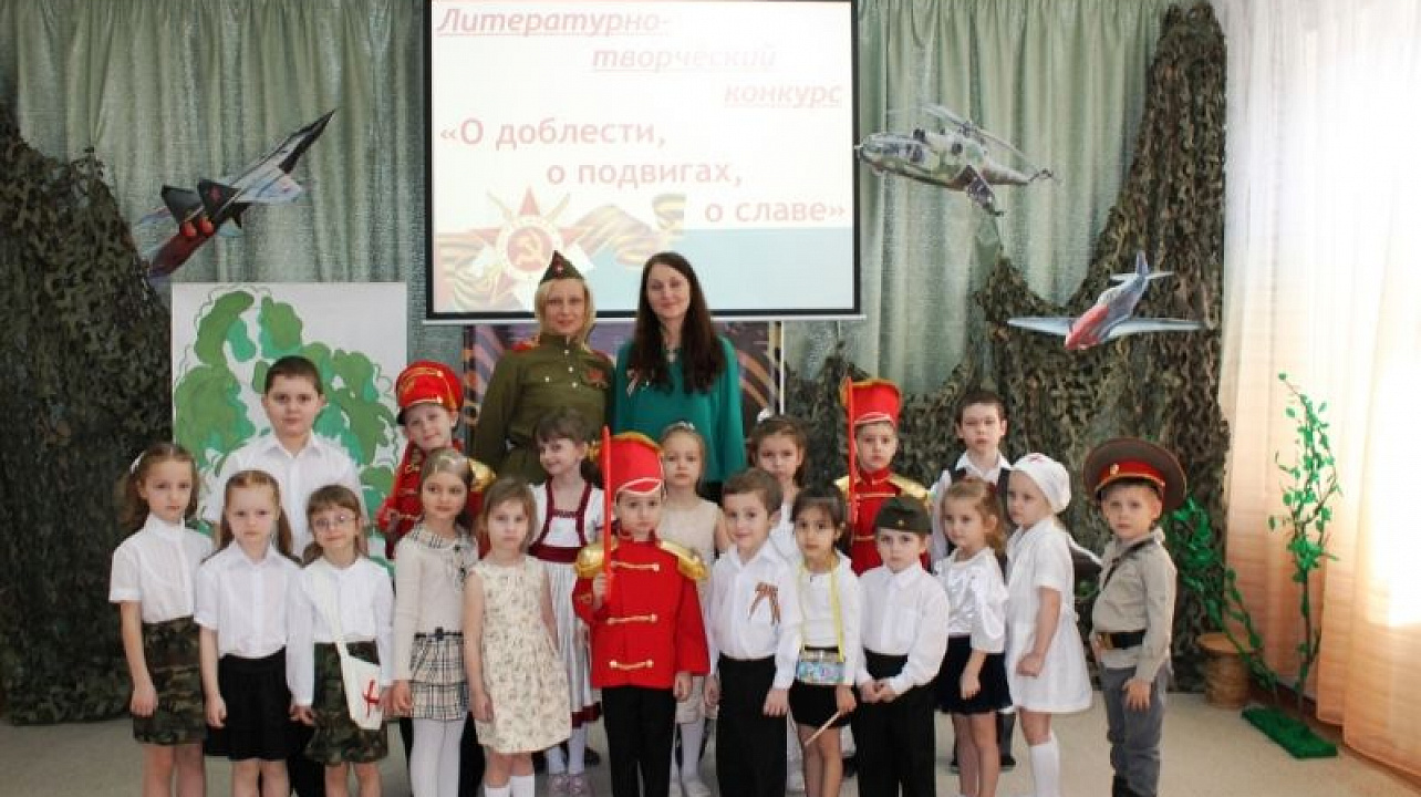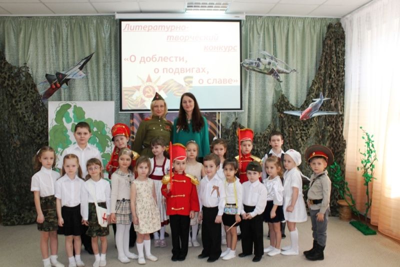 В детском саду № 23 прошел литературно-творческий конкурс: «О доблести, о подвигах, о славе». Воспитали с ребятами ответственно подошли к подготовке конкурсных выступлений – придумали костюмы, атрибуты, музыкальное сопровождение.