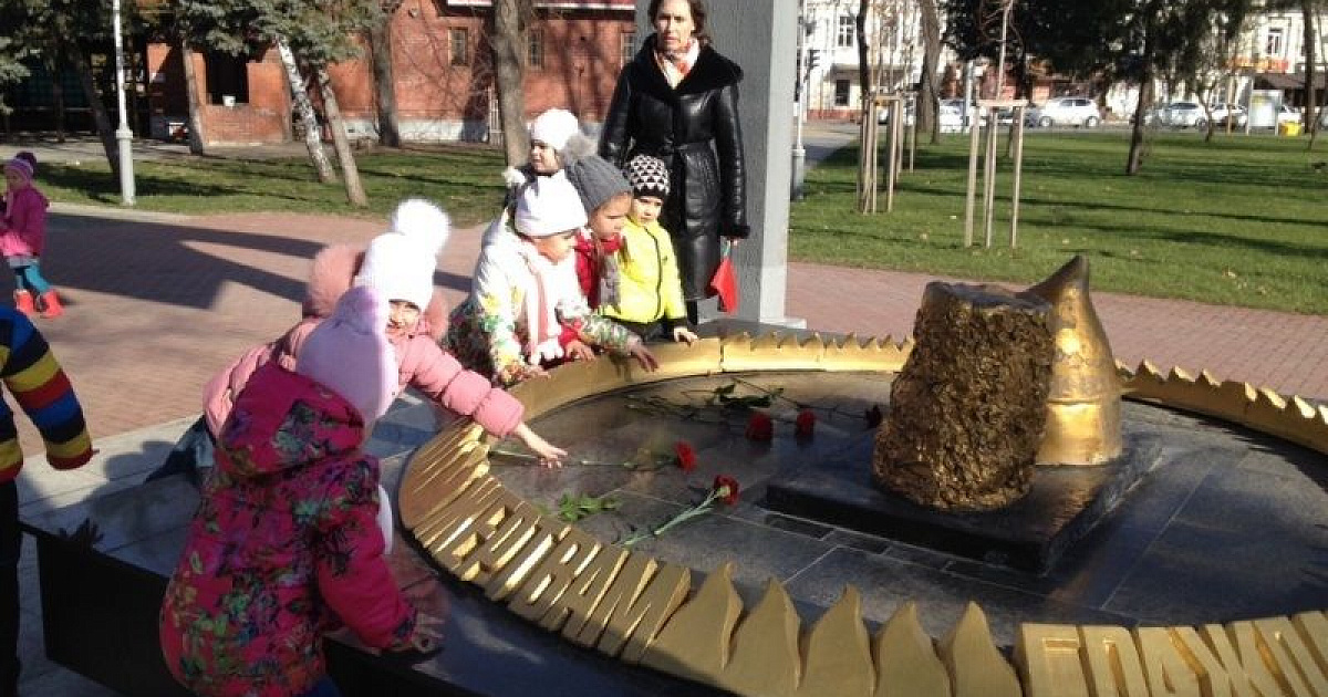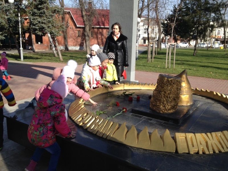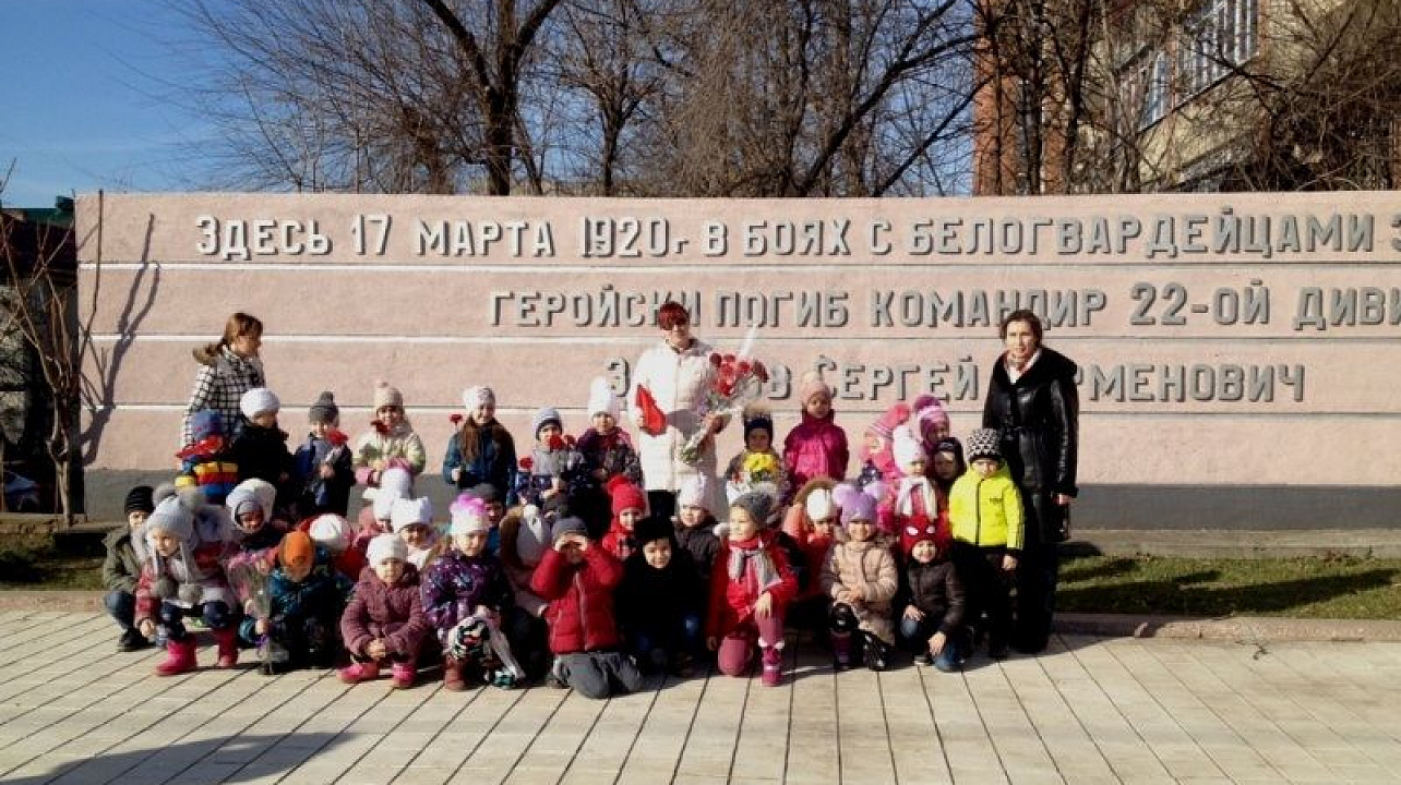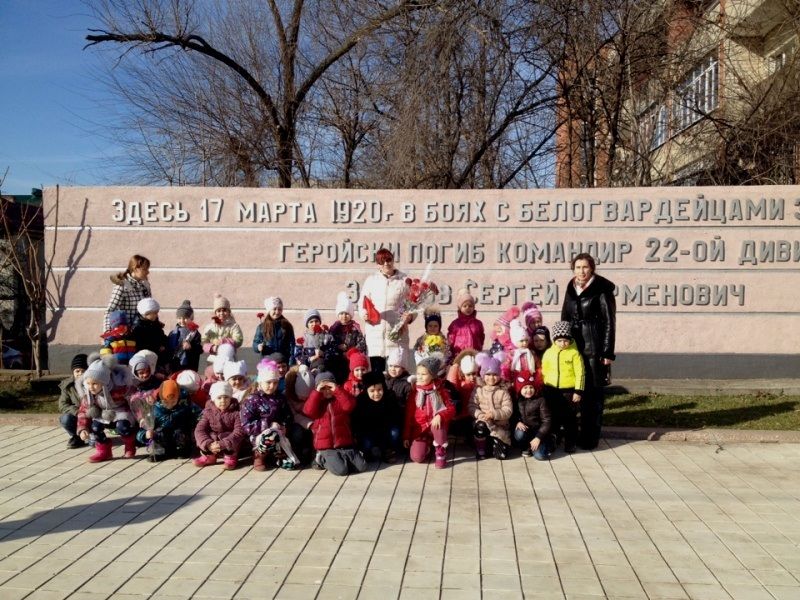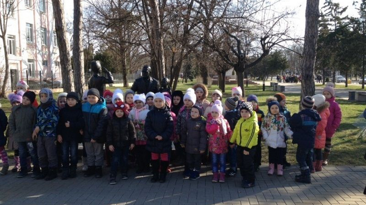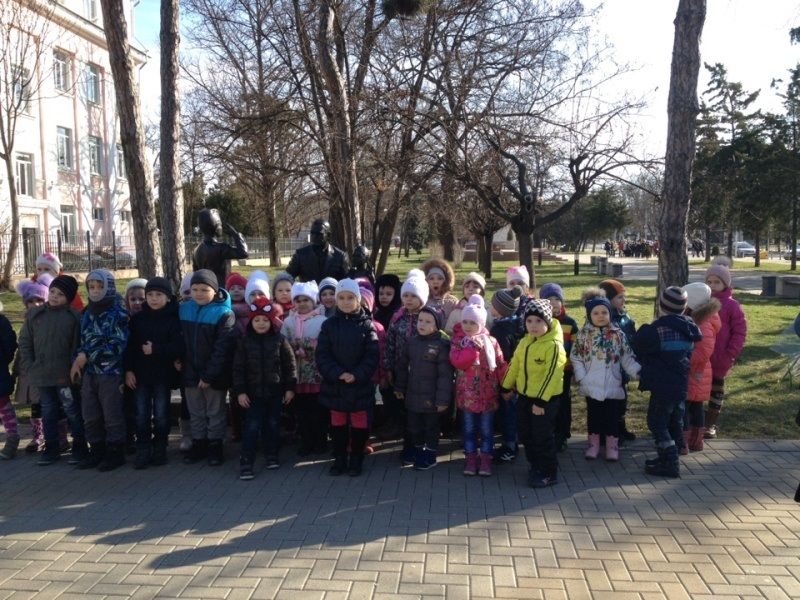 Открытие памятника «Воин — освободитель», который находится на Площади Победы, состоялось 9 мая 1965 года. Скульптор И. П. Шмагун и архитектор Е. Г. Лашук создали глубоко волнующий монумент советским воинам, принимавшим участие в освобождении Краснодара от немецко-фашистских захватчиков. Воспитатели рассказала детям об этих фактах. Дошколята и воспитатели возложили цветы к памятнику и прочитали стихи, посвященные Дню защитника Отечества.