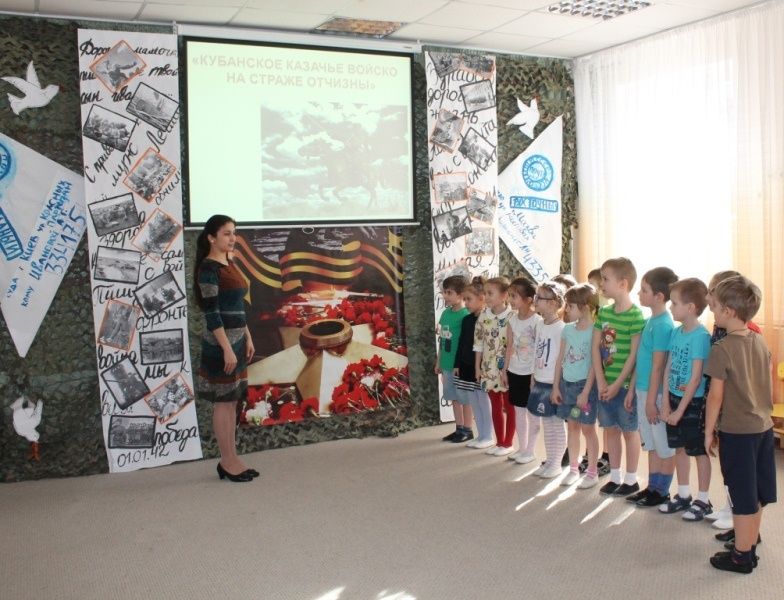Воспитатель Марина Лузан познакомила ребят с героическим прошлым и настоящим нашего Отечества, с фольклорным наследием кубанского народного творчества, обычаями и традициями. Рассказала о военной службе казаков, отношении к чести и долгу.