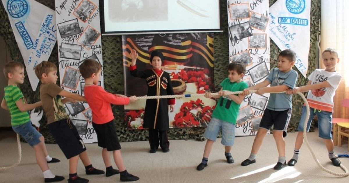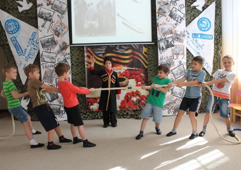 Мальчики, будущие казачата, участвовали в состязании — перетягивание каната (кубанская народная игра «Коники»), а девочки исполнили частушки.