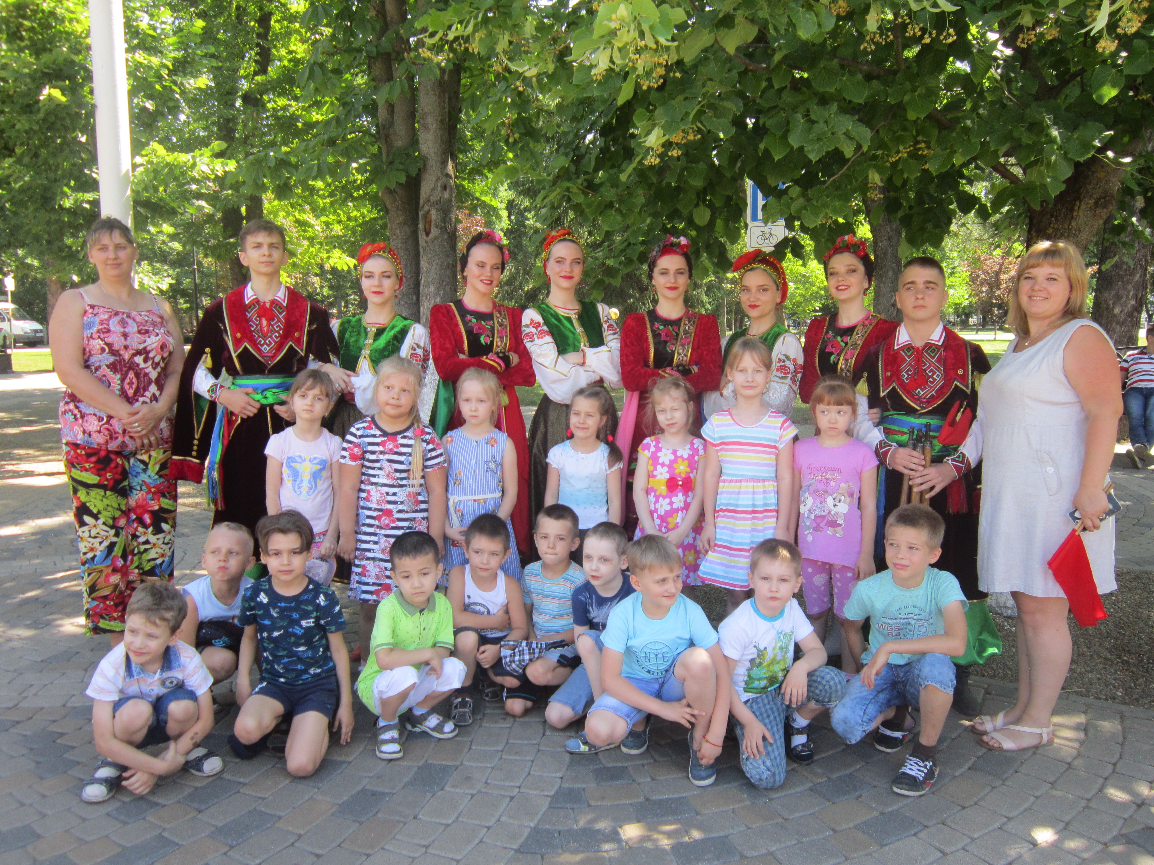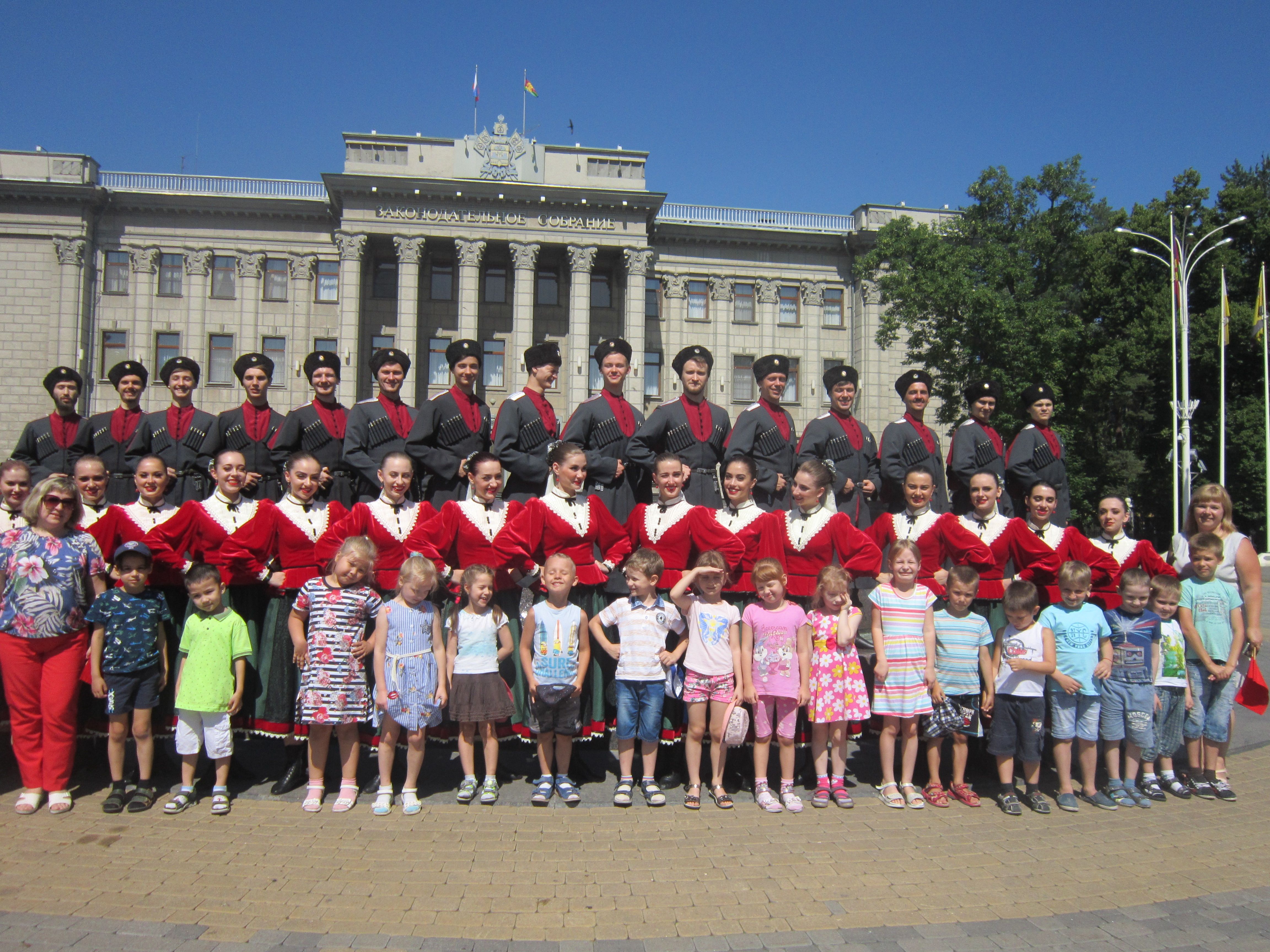 На площади воспитанники детского сада № 94 встретили два народных танцевальных коллектива из станицы Елизаветинской — «Коханочка» и «Станица». Молодые люди приехали в Краснодар, чтобы принять участие в подготовке к торжеству, которое состоится непосредственно 12 июня, в День России. Артисты рассказали ребятам о народном творчестве, исполнили несколько кубанских песен, показали основные движения народных танцев. Дети с большим интересом слушали молодых артистов, с удовольствием повторяя за ними движения. И, конечно, заключением нашего общения стали фотографии на память!