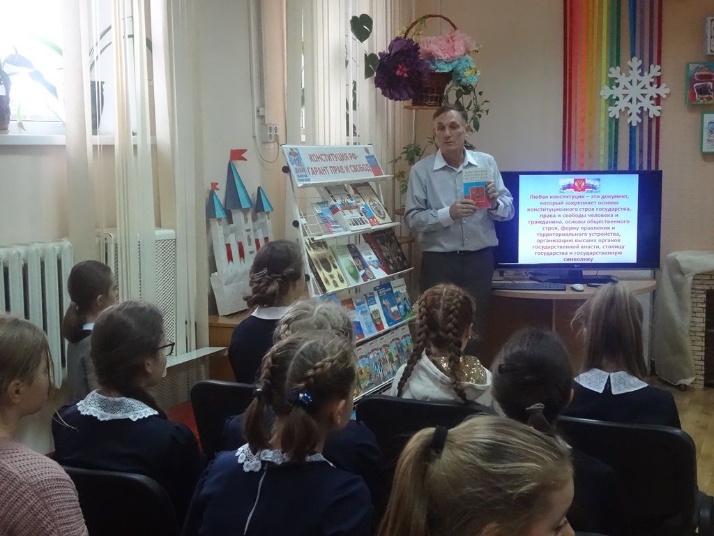 Библиотека им. И. А. Гончарова провела час правовой информации «Конституция России: ваши права и свободы» в выездном читальном зале при МБОУ СОШ № 14. Ведущая познакомила с основными положениями Конституции РФ, продемонстрировала презентацию, которая помогла понять структуру Конституции РФ. Викторина по правам и обязанностям человека дополнила мероприятие.